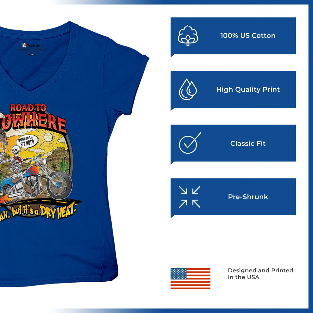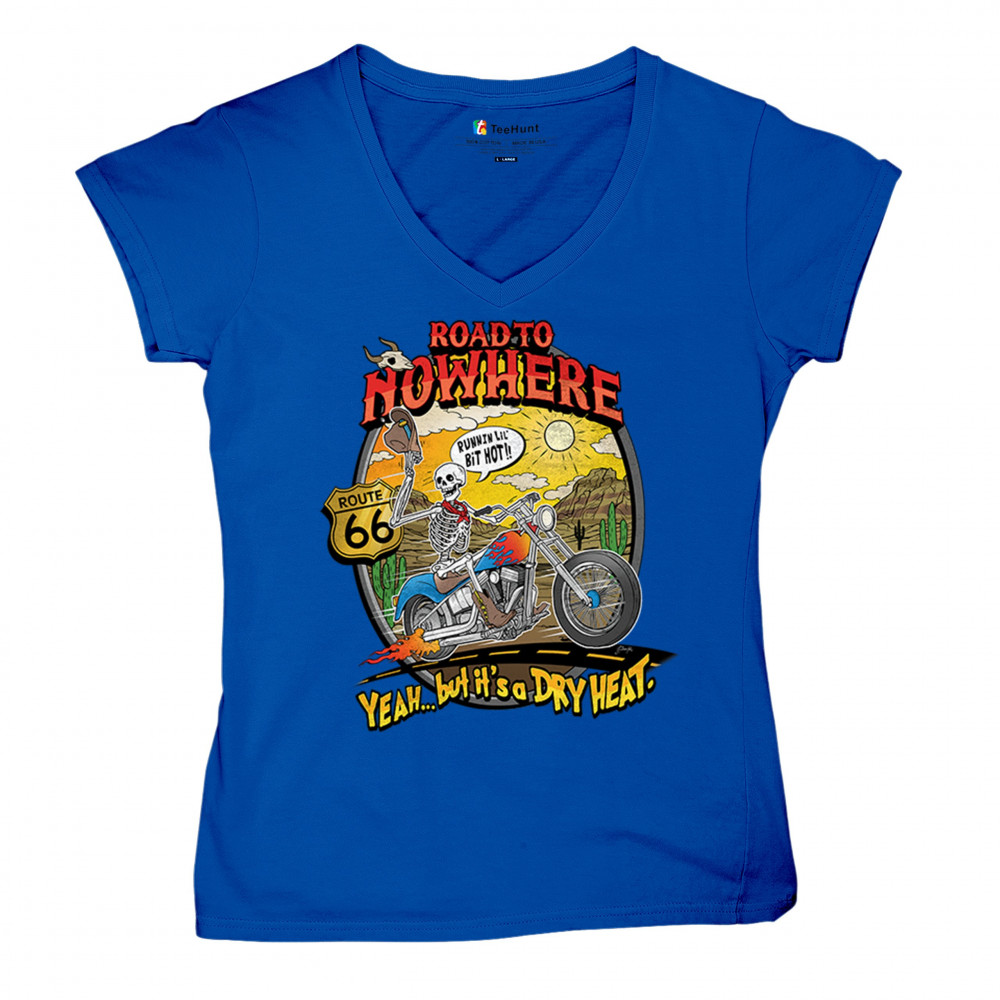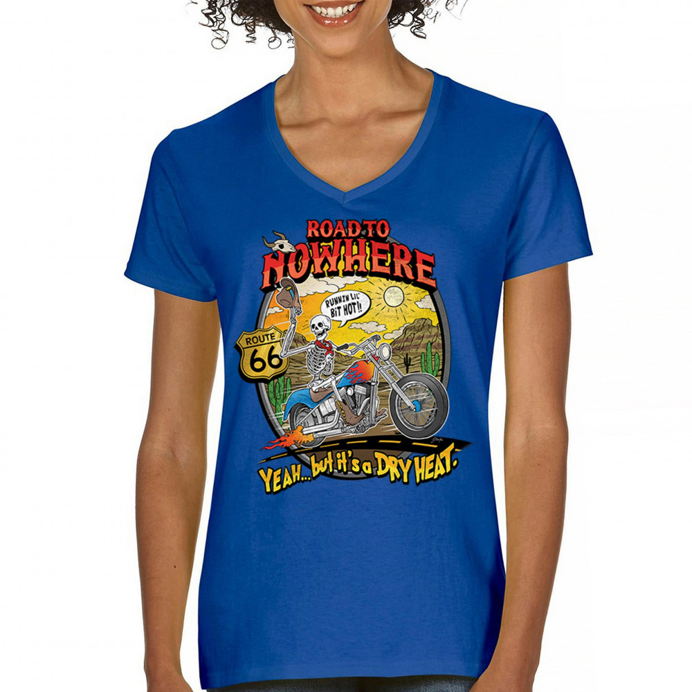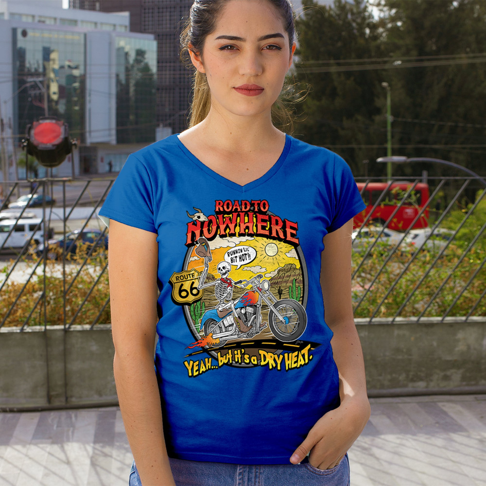 Discover the 'Road to Nowhere' T-shirt: a blend of bold graphics and adventurous spirit. Embrace the ride with our Route 66 skeleton biker design.