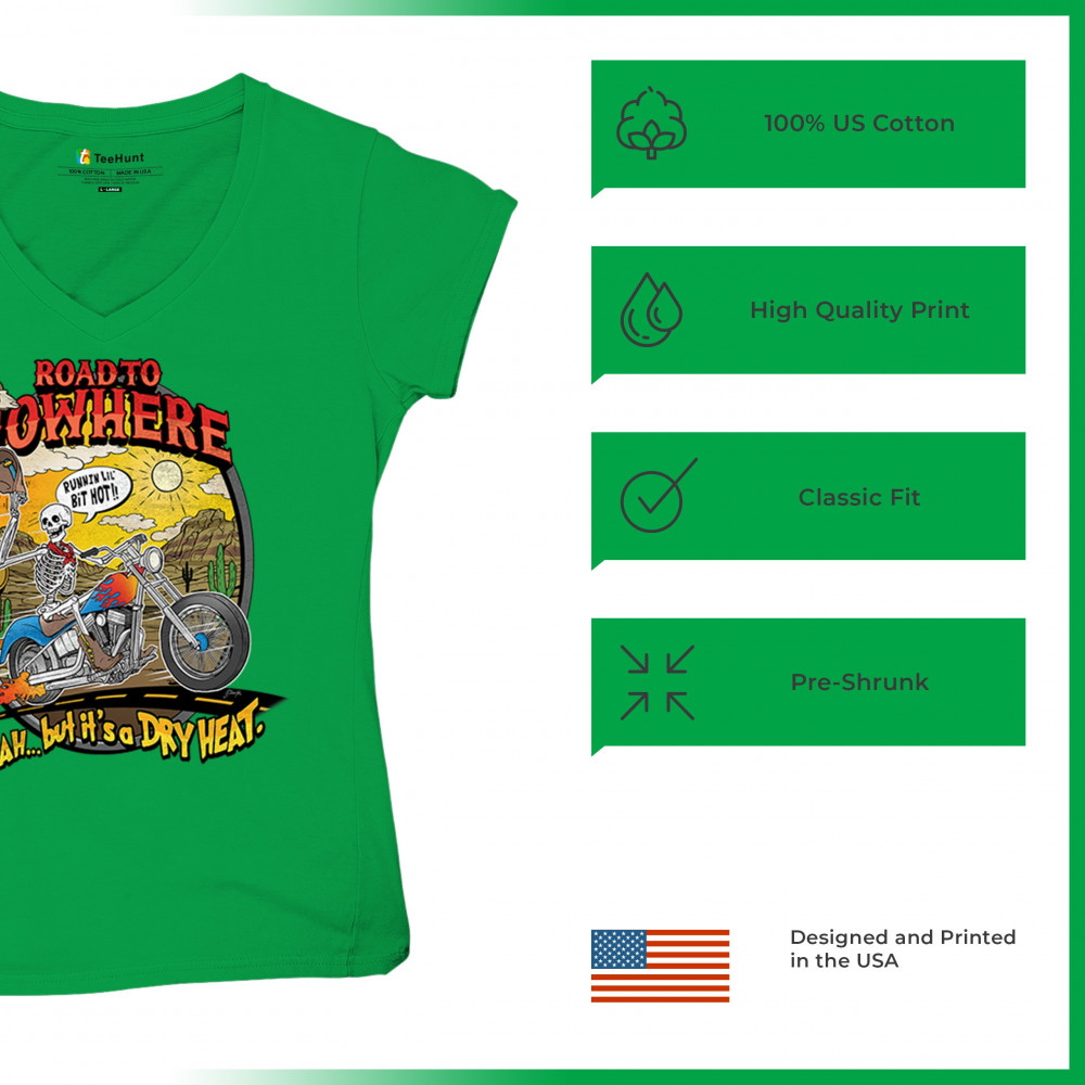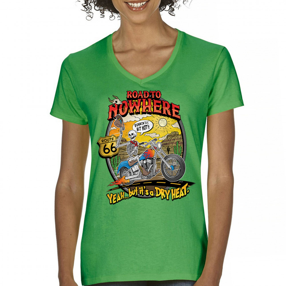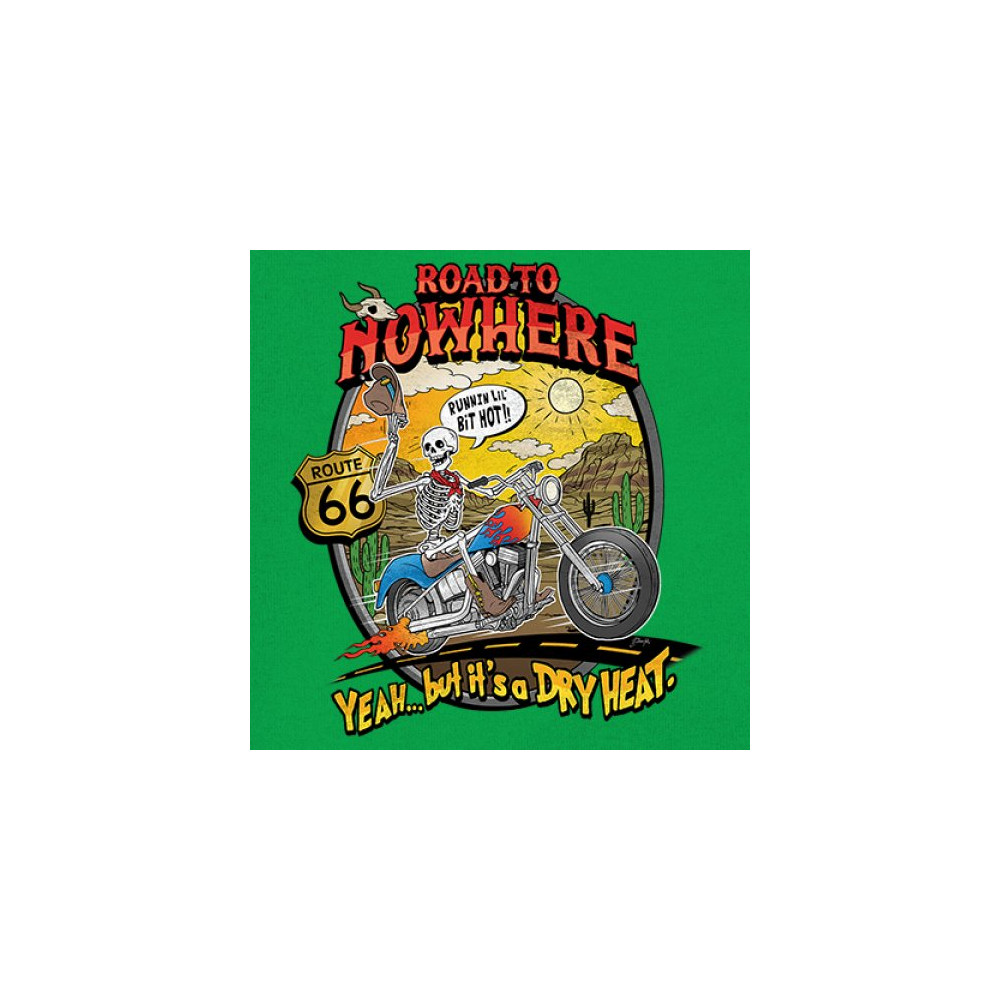Discover the 'Road to Nowhere' T-shirt: a blend of bold graphics and adventurous spirit. Embrace the ride with our Route 66 skeleton biker design.