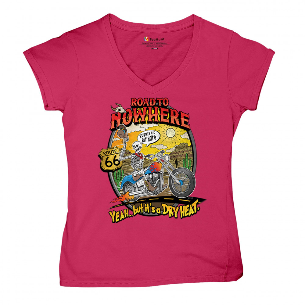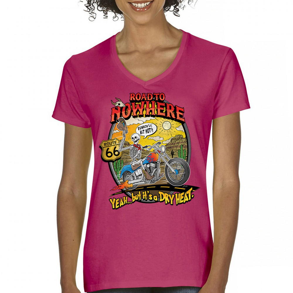 Discover the 'Road to Nowhere' T-shirt: a blend of bold graphics and adventurous spirit. Embrace the ride with our Route 66 skeleton biker design.