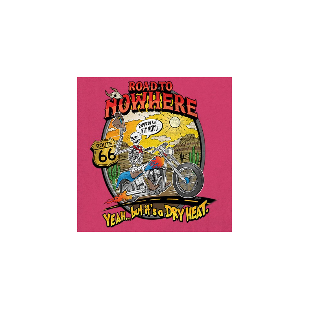 Our 'Road to Nowhere' tee is a salute to the thrill-seekers and the heat-bravers. Adorned with a bold skeleton cruising down Route 66, it embodies the spirit of adventure with a touch of playful defiance. A statement piece for anyone who lives for the ride and laughs in the face of danger. Join the ride into the sunset with this daring design.