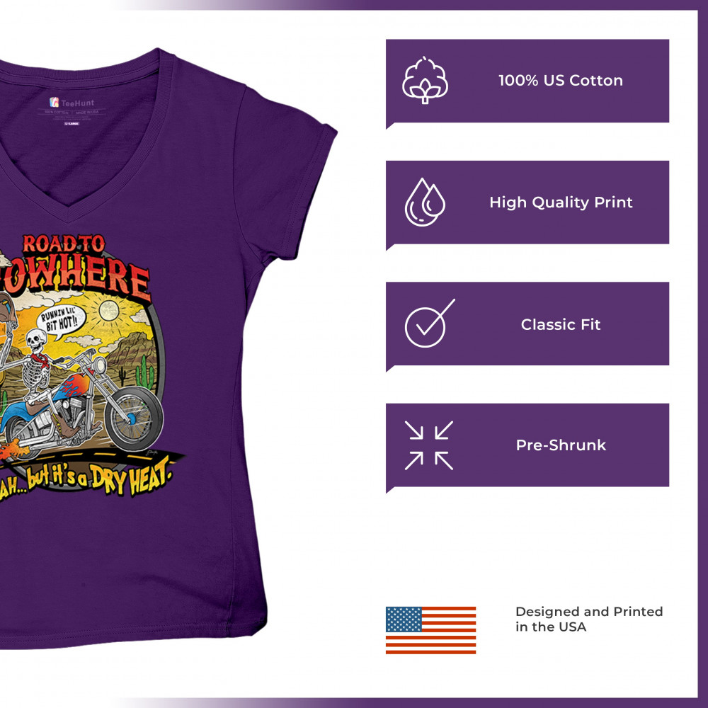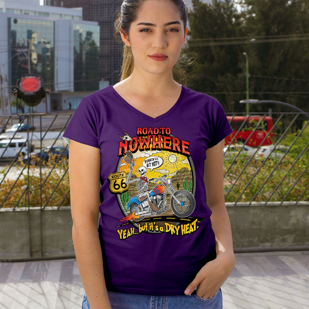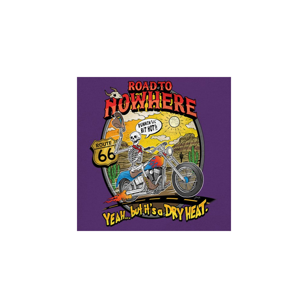 Our 'Road to Nowhere' tee is a salute to the thrill-seekers and the heat-bravers. Adorned with a bold skeleton cruising down Route 66, it embodies the spirit of adventure with a touch of playful defiance. A statement piece for anyone who lives for the ride and laughs in the face of danger. Join the ride into the sunset with this daring design.