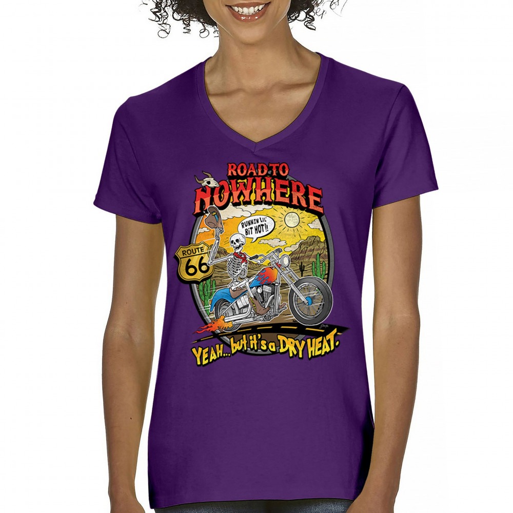 Discover the 'Road to Nowhere' T-shirt: a blend of bold graphics and adventurous spirit. Embrace the ride with our Route 66 skeleton biker design.