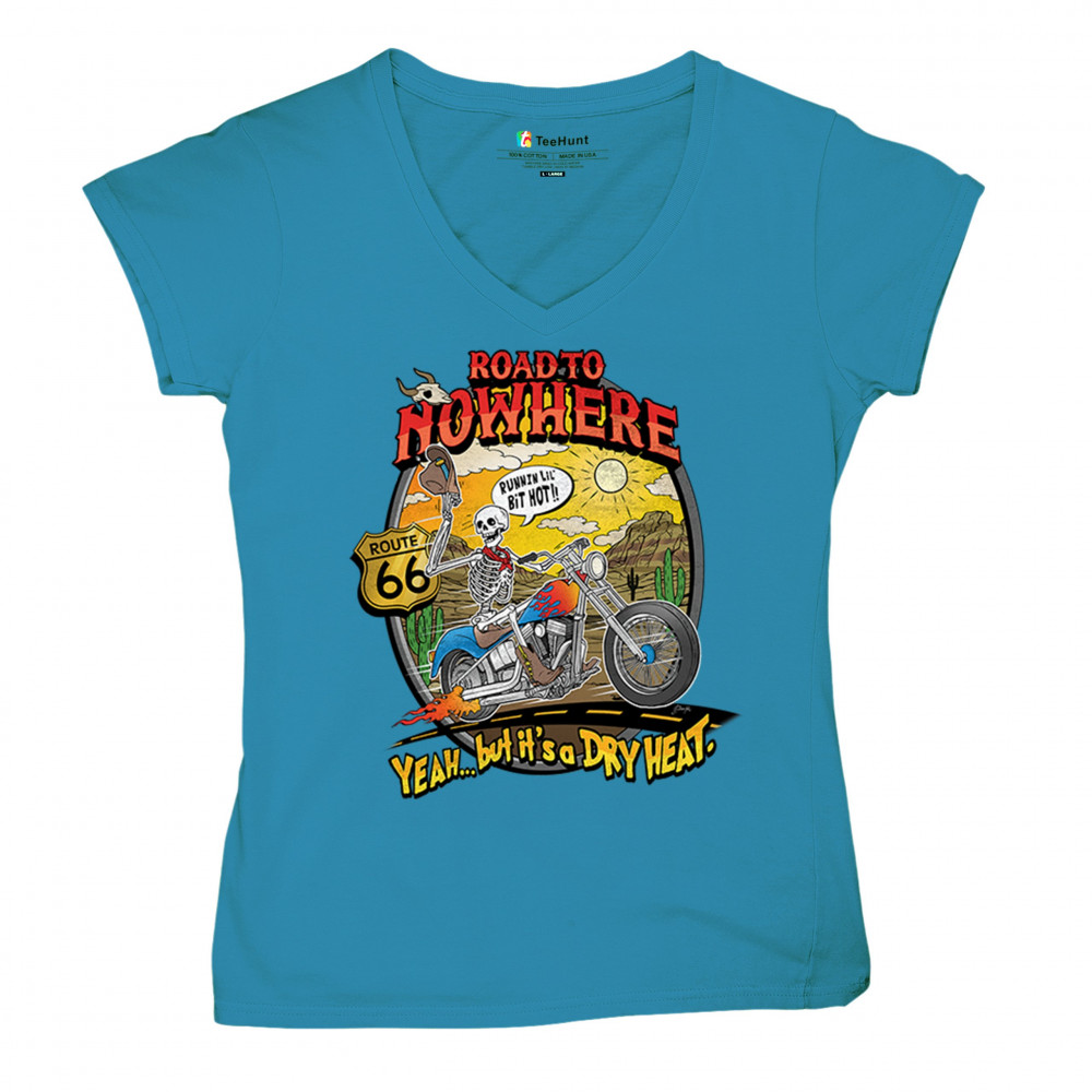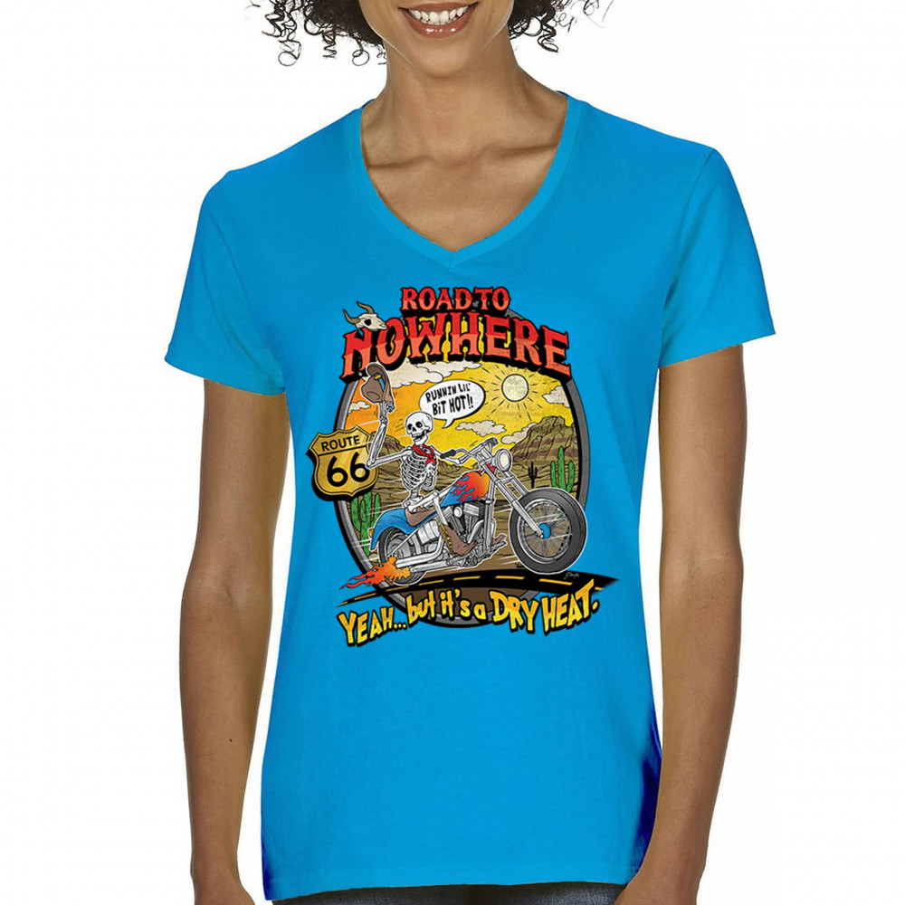 Discover the 'Road to Nowhere' T-shirt: a blend of bold graphics and adventurous spirit. Embrace the ride with our Route 66 skeleton biker design.