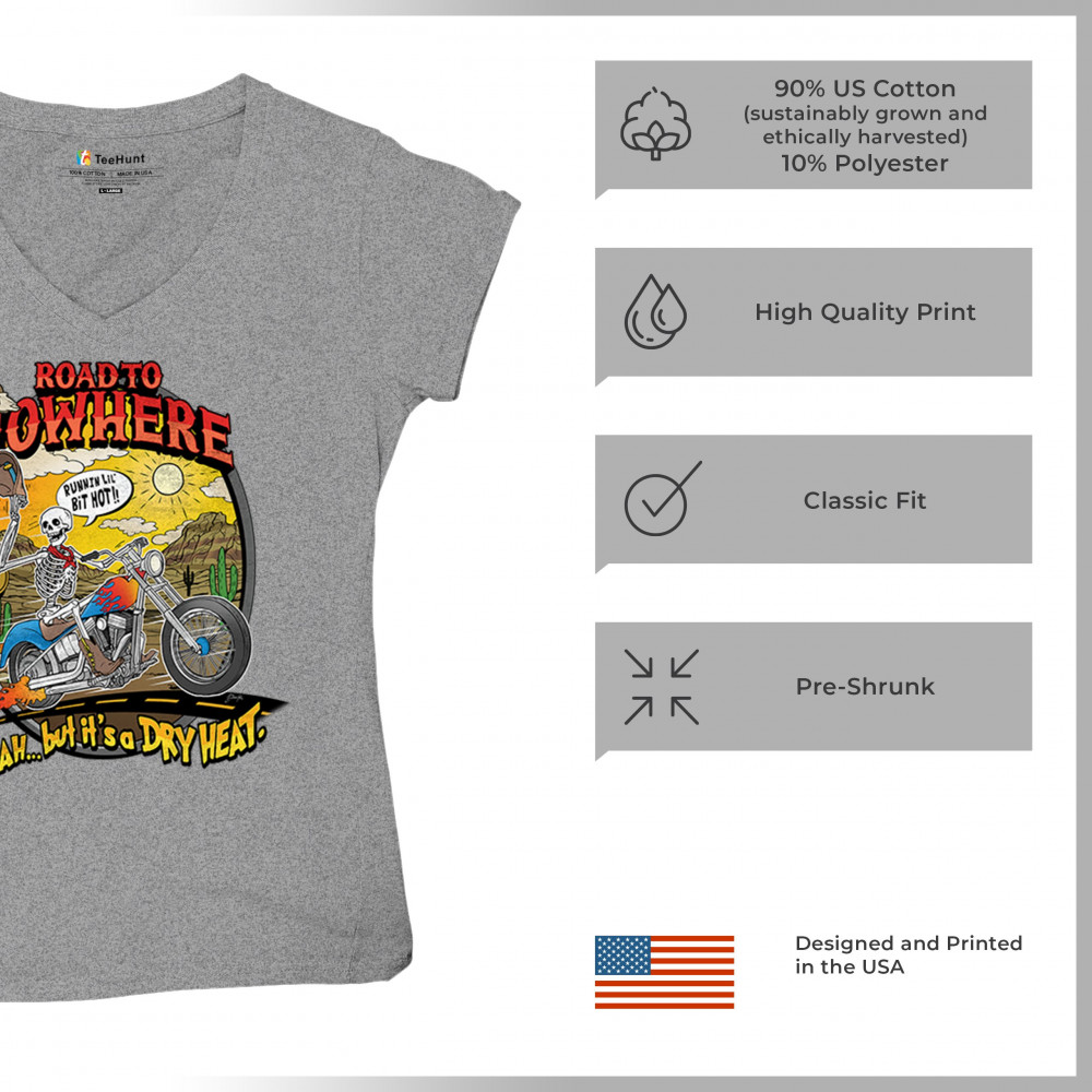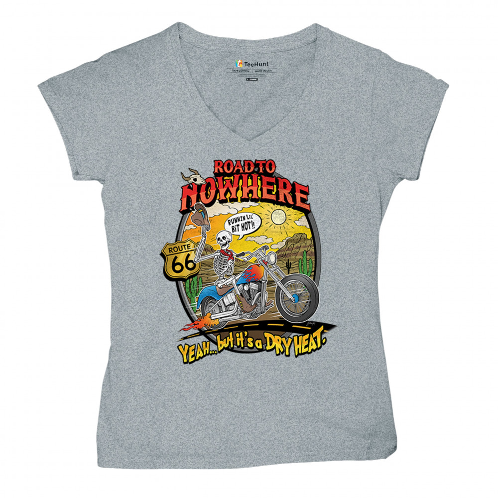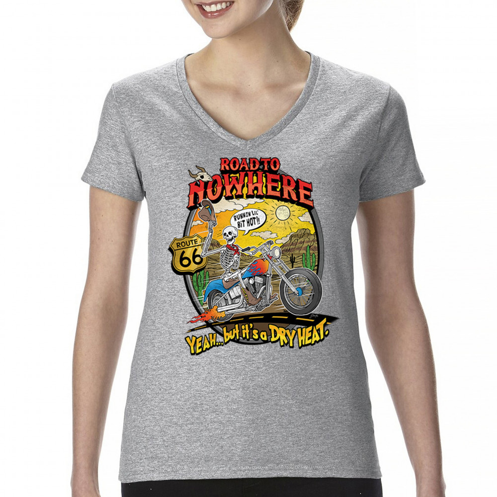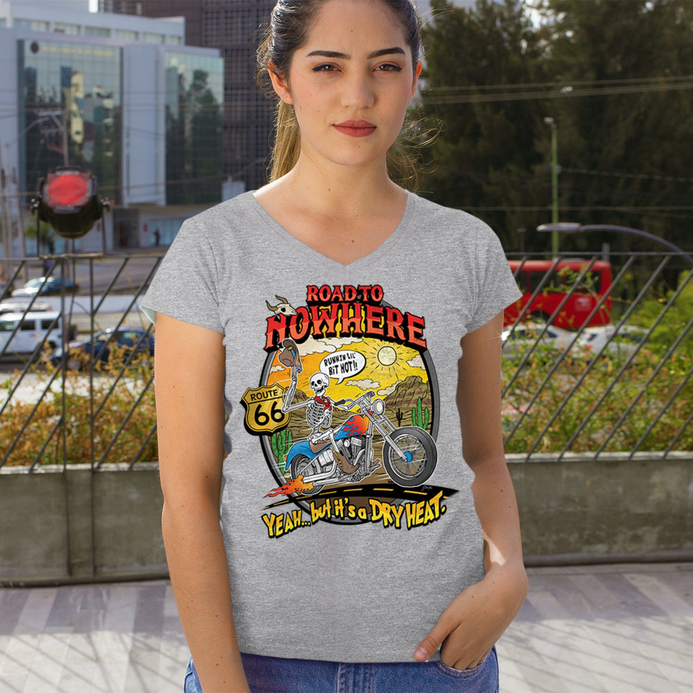 Discover the 'Road to Nowhere' T-shirt: a blend of bold graphics and adventurous spirit. Embrace the ride with our Route 66 skeleton biker design.