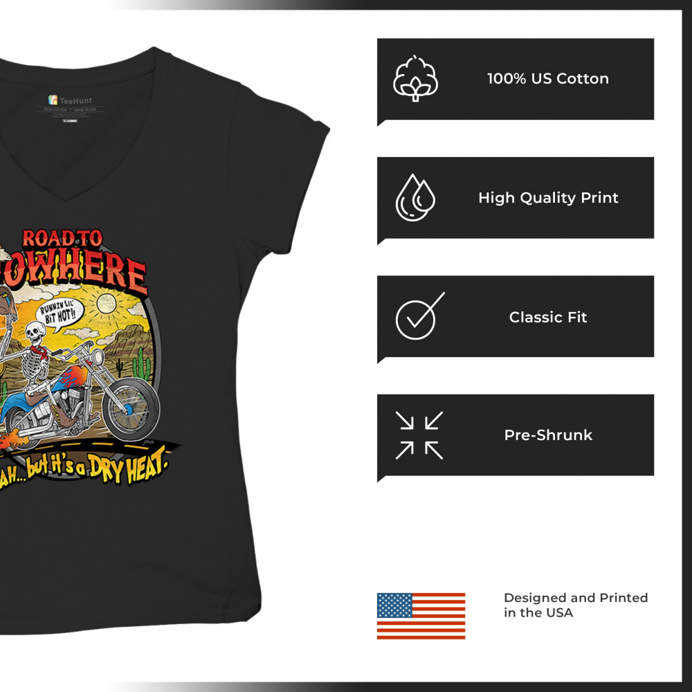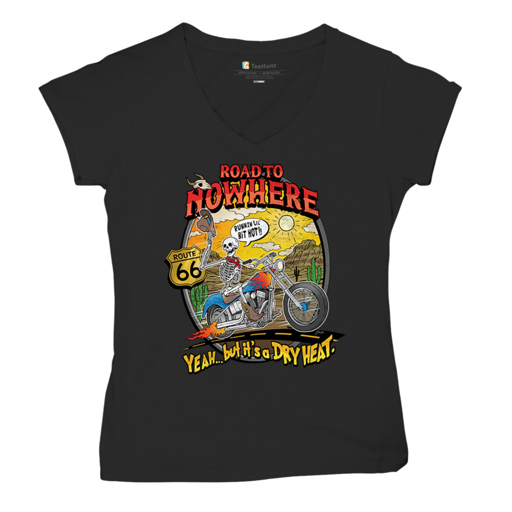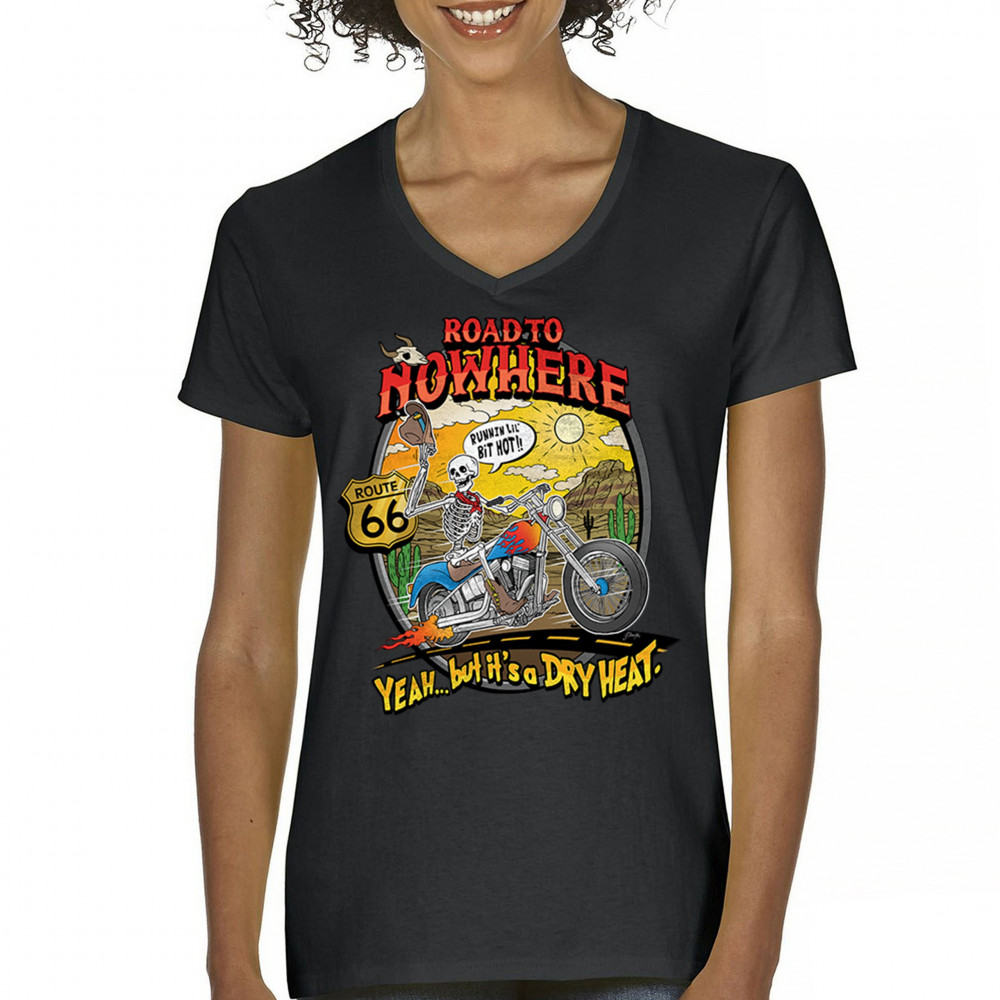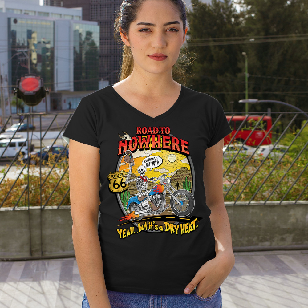 Discover the 'Road to Nowhere' T-shirt: a blend of bold graphics and adventurous spirit. Embrace the ride with our Route 66 skeleton biker design.