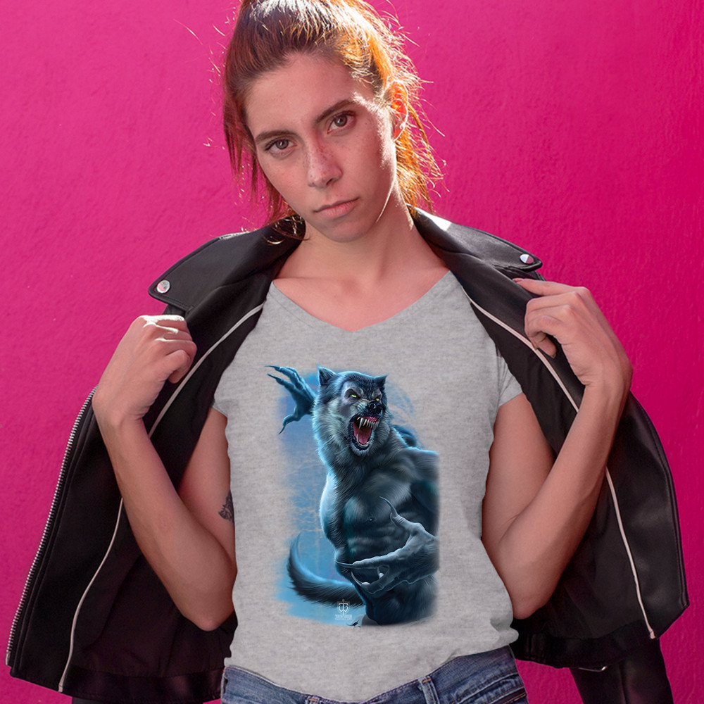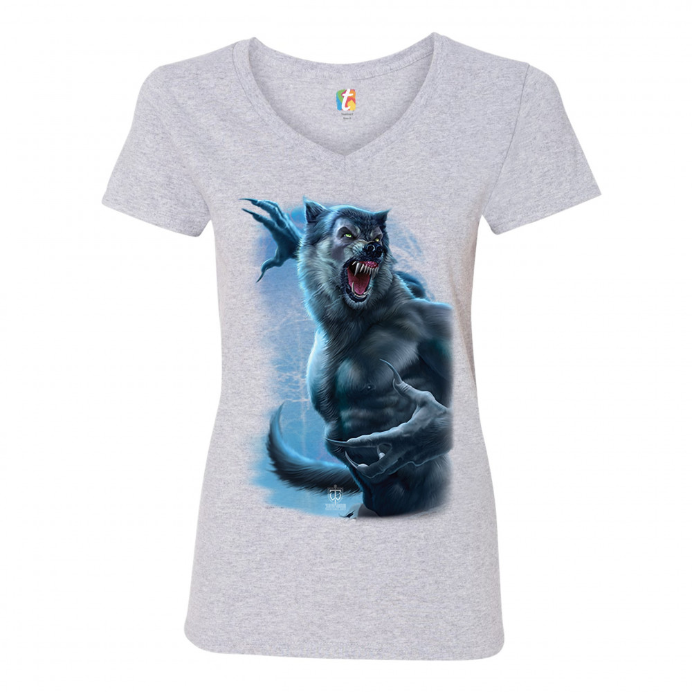 ROARING WEREWOLF women's v-neck t-shirt halloween scary gothic monster tee gray