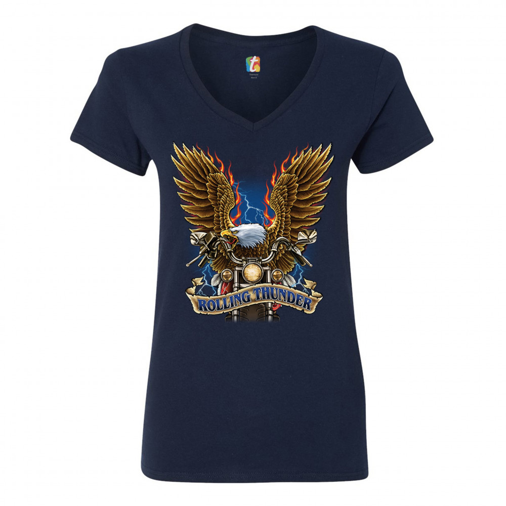 ROLLING THUNDER women's v-neck t-shirt biker born to be wild bald eagle tee navy blue