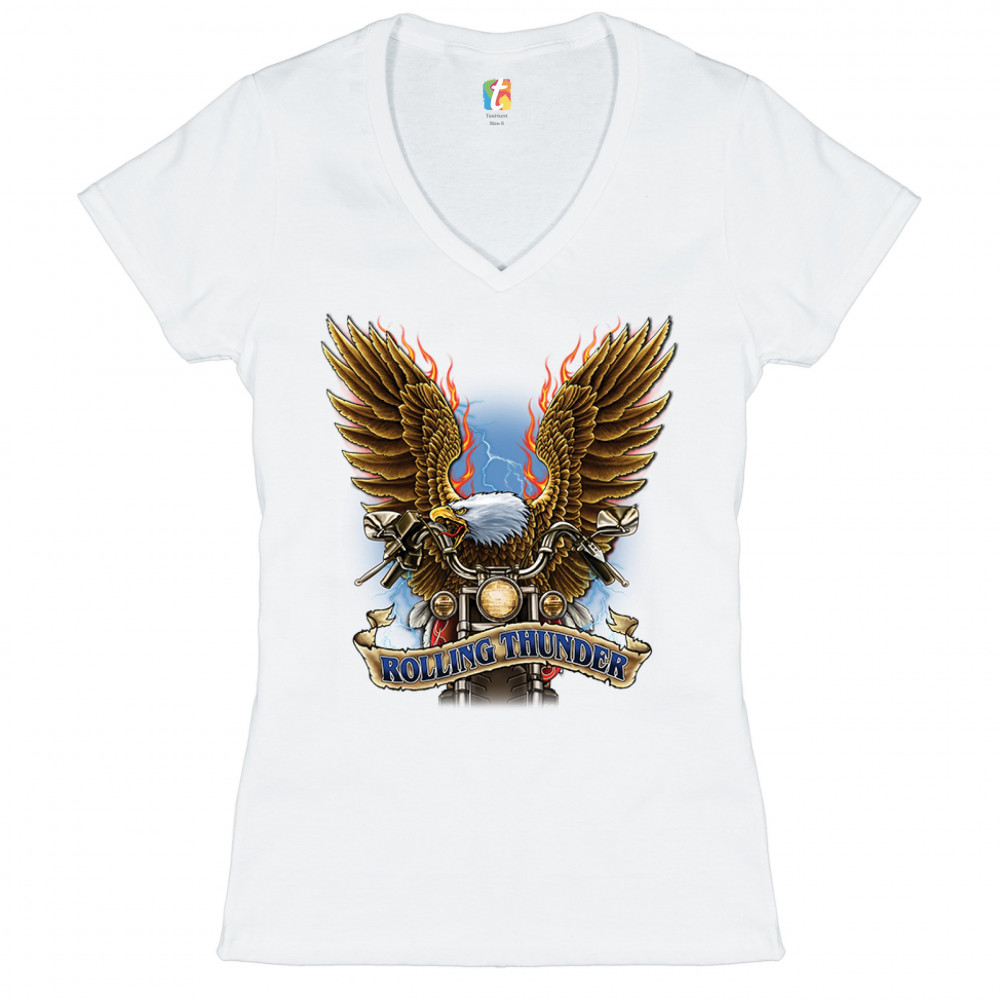 ROLLING THUNDER women's v-neck t-shirt biker born to be wild bald eagle tee white