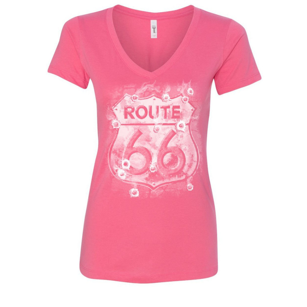 ROUTE 66 SIGN WITH BULLET HOLES route 66 women's v-neck t-shirt bullet holes the mother road american highway pink