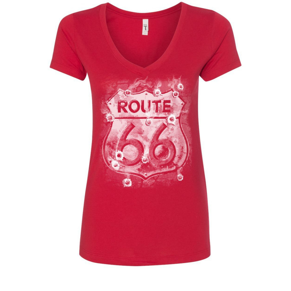 ROUTE 66 SIGN WITH BULLET HOLES route 66 women's v-neck t-shirt bullet holes the mother road american highway red
