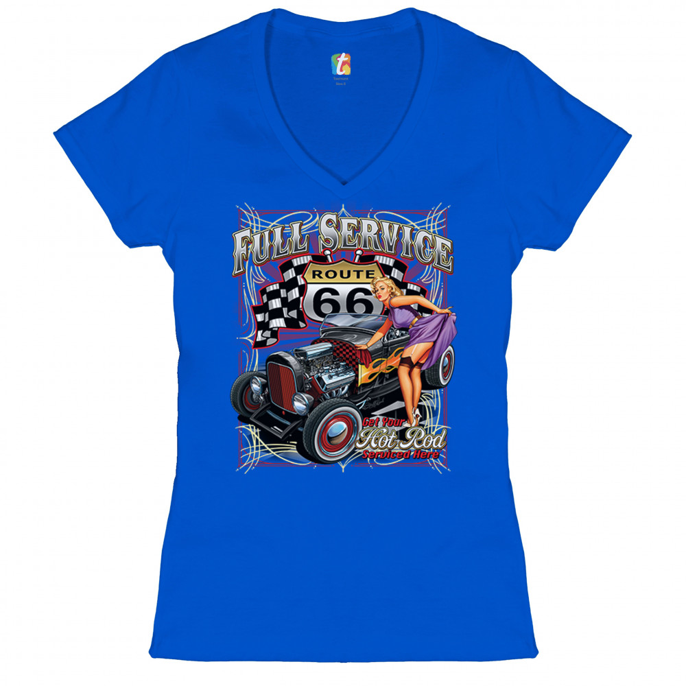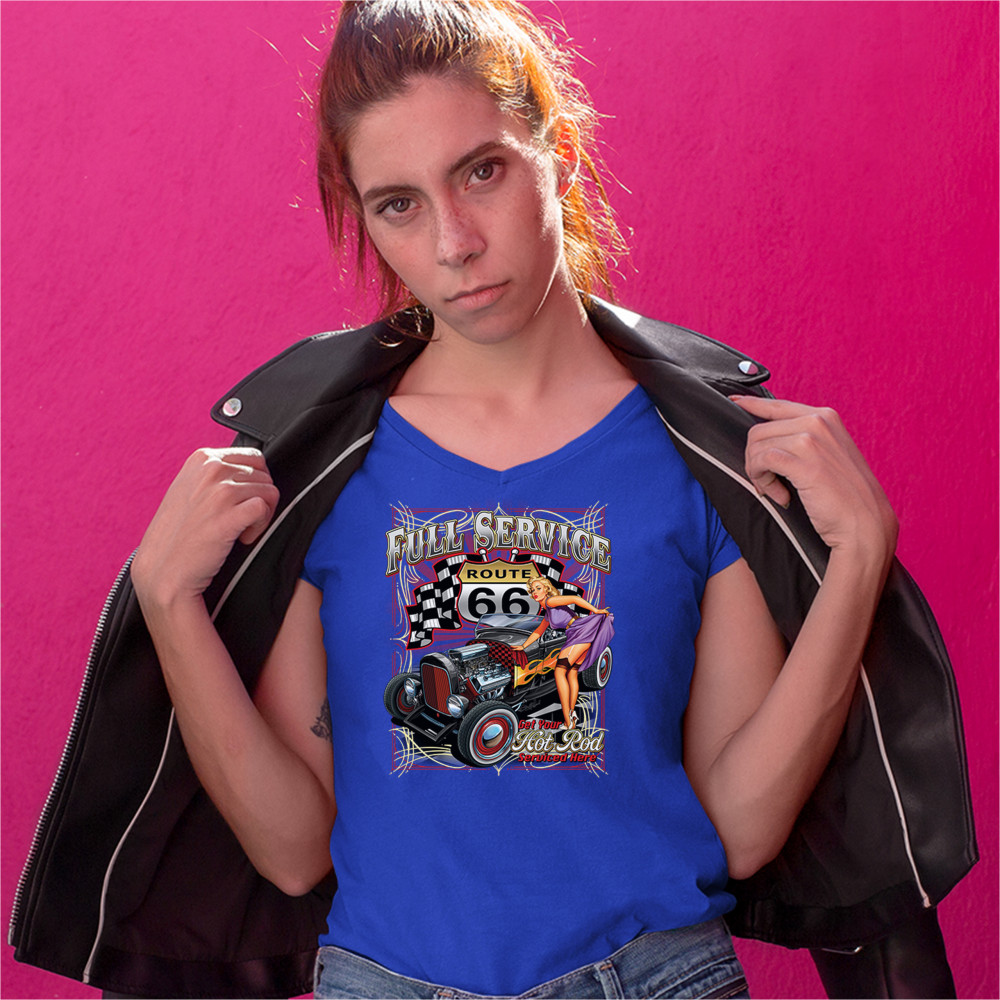 A print featuring a hot rod muscle car with flames painted on it's sides. There is a beautiful pin-up girl in stockings standing near it lifting her dress with one hand. The prints says: "full service" and "get your hot rod serviced here". In the background there is a Route 66 sign with racing flags to it's sides. Great for Route 66 and hot rod fans.