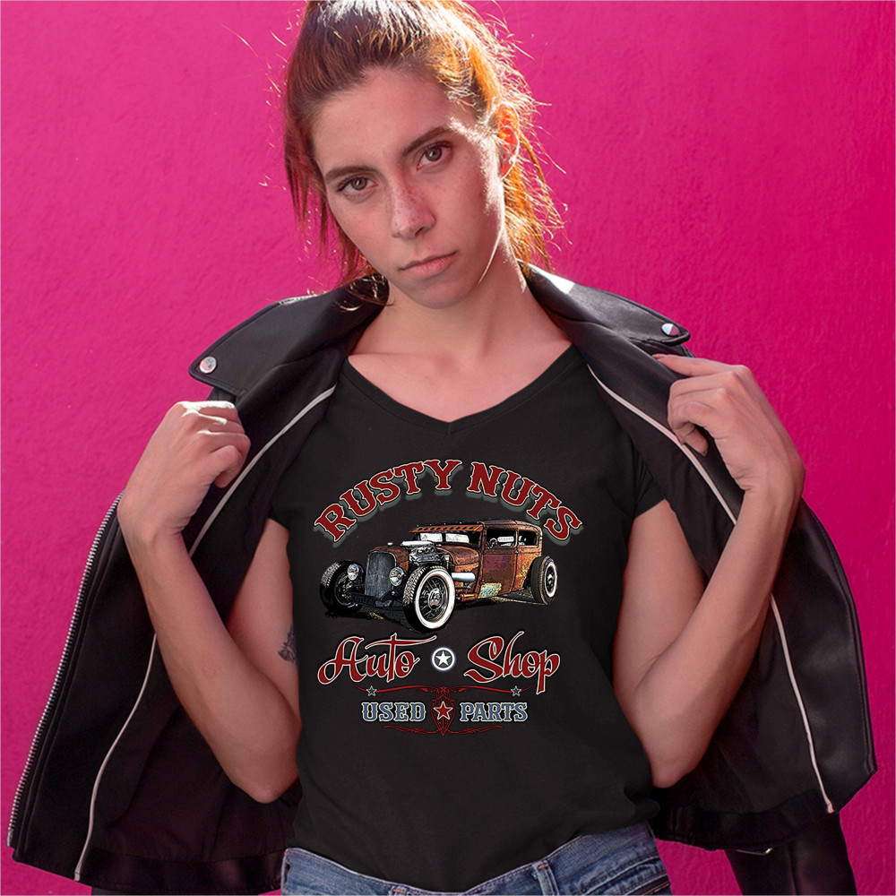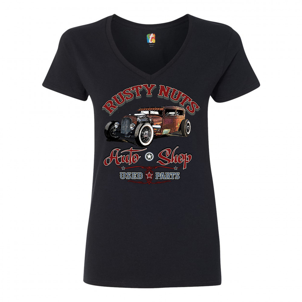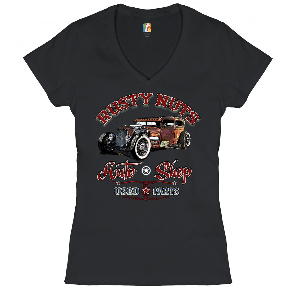 RUSTY NUTS AUTO SHOP women's v-neck t-shirt hot rod rat rod old school tee black