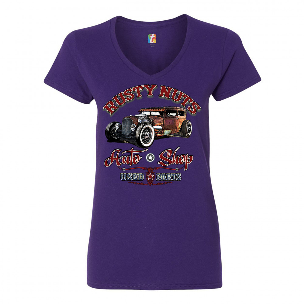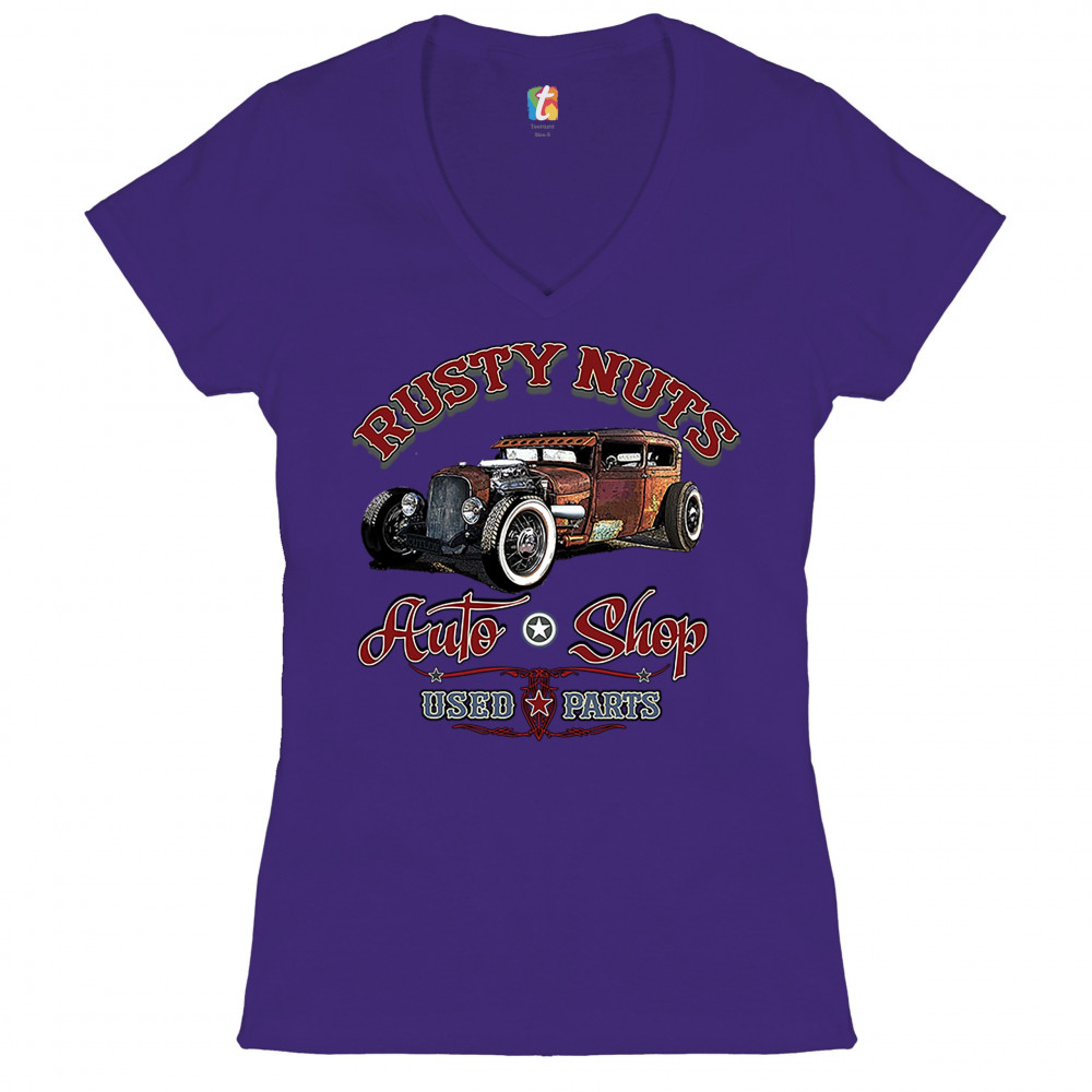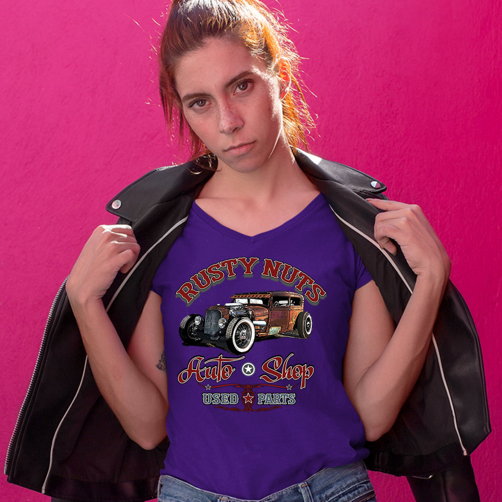 RUSTY NUTS AUTO SHOP women's v-neck t-shirt hot rod rat rod old school tee purple