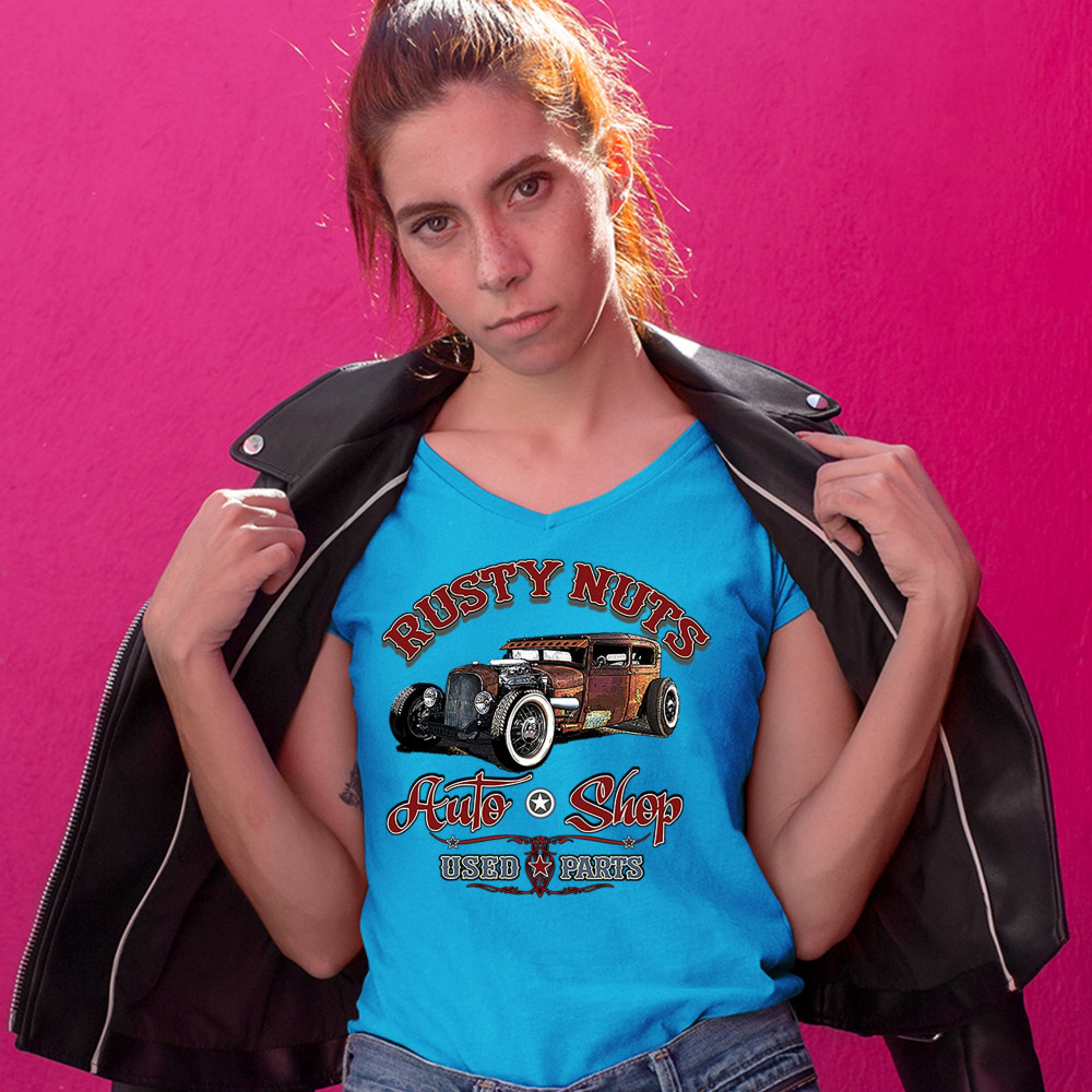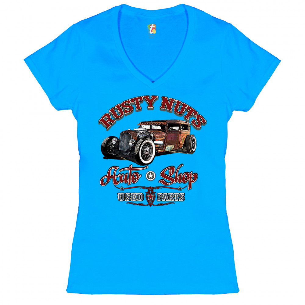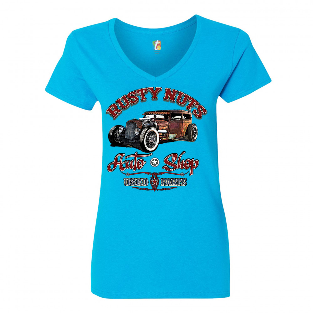 RUSTY NUTS AUTO SHOP women's v-neck t-shirt hot rod rat rod old school tee turquoise