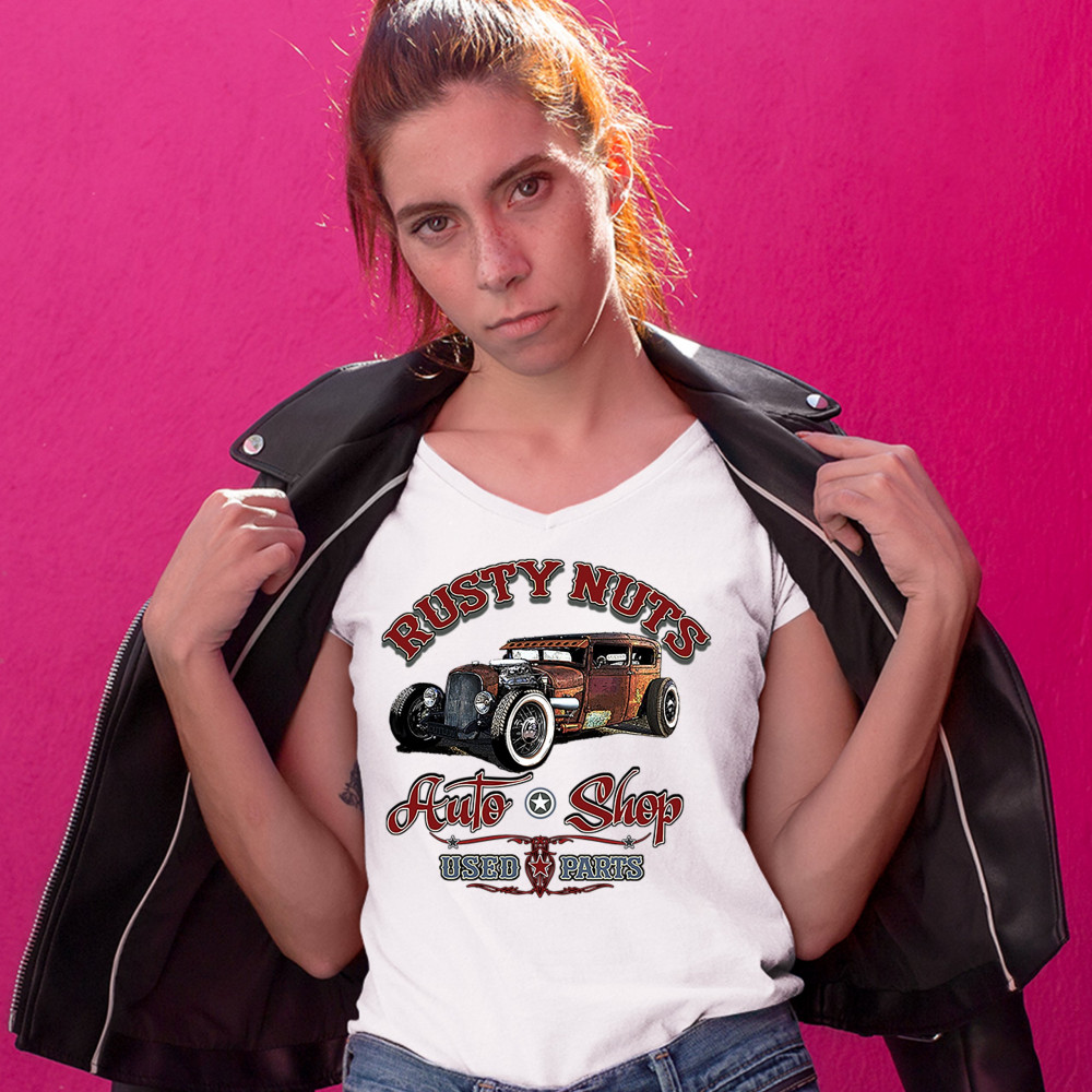 RUSTY NUTS AUTO SHOP women's v-neck t-shirt hot rod rat rod old school tee white