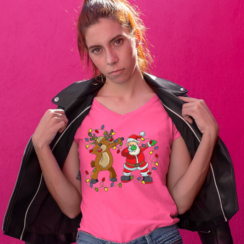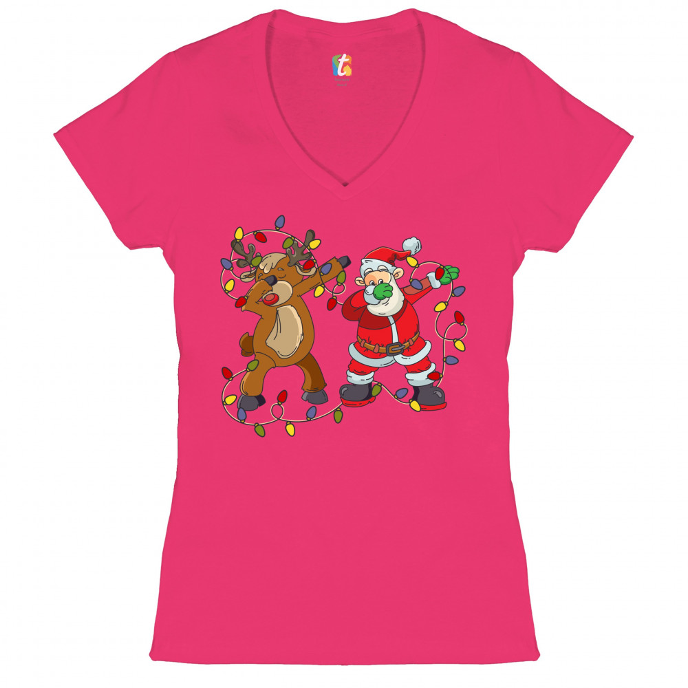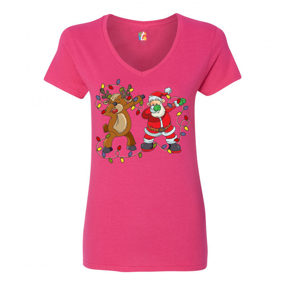 SANTA CLAUS AND RUDOLPH DAB DANCE women's v-neck t-shirt merry christmas tee pink