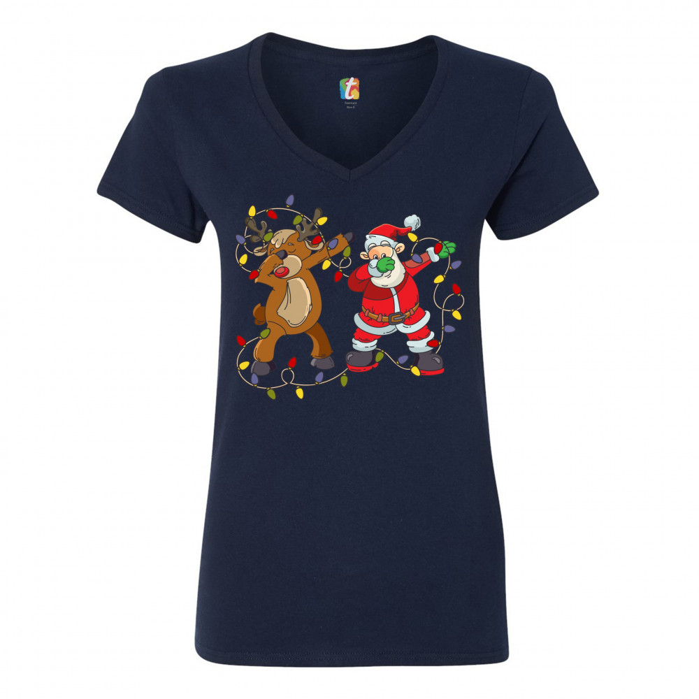 SANTA CLAUS AND RUDOLPH DAB DANCE women's v-neck t-shirt merry christmas tee navy blue