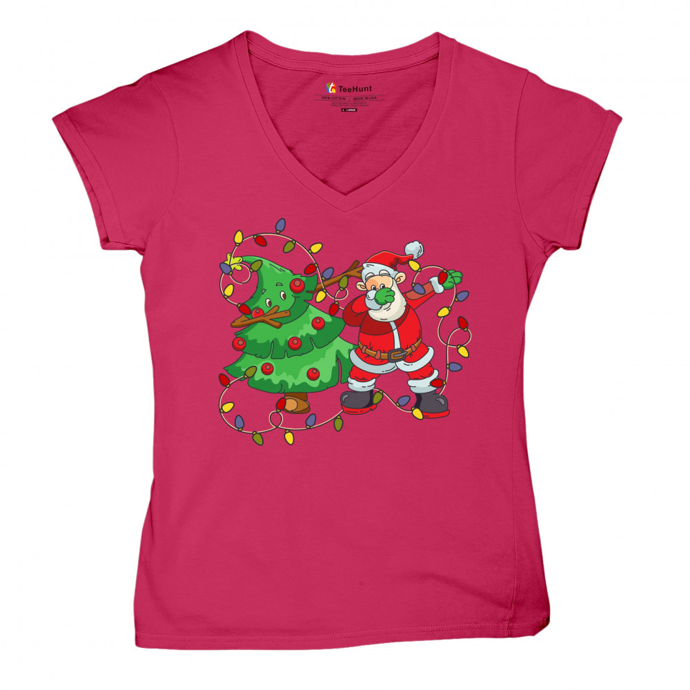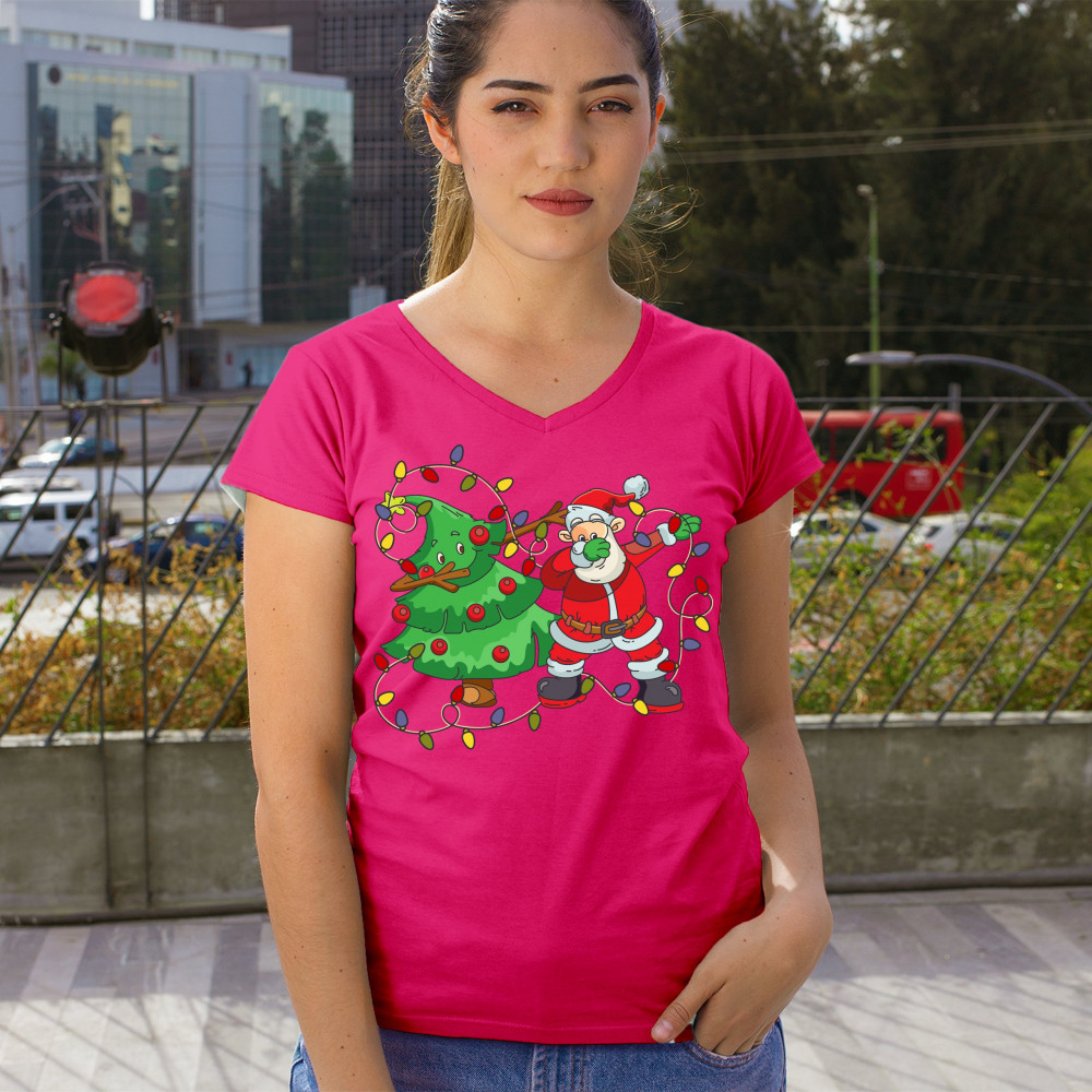 SANTA CLAUS DABBING WITH CHRISTMAS TREE women's v-neck t-shirt merry xmas tee pink