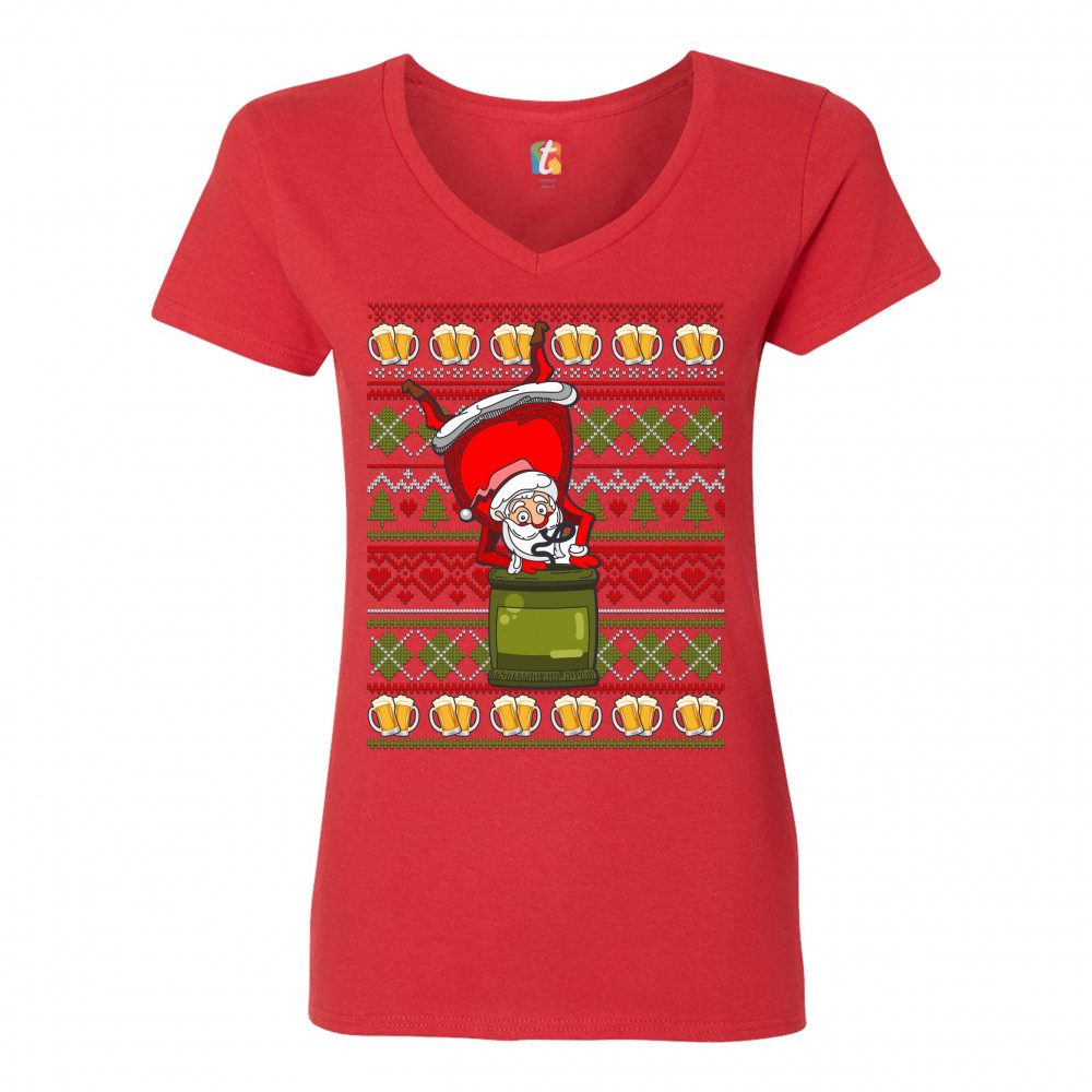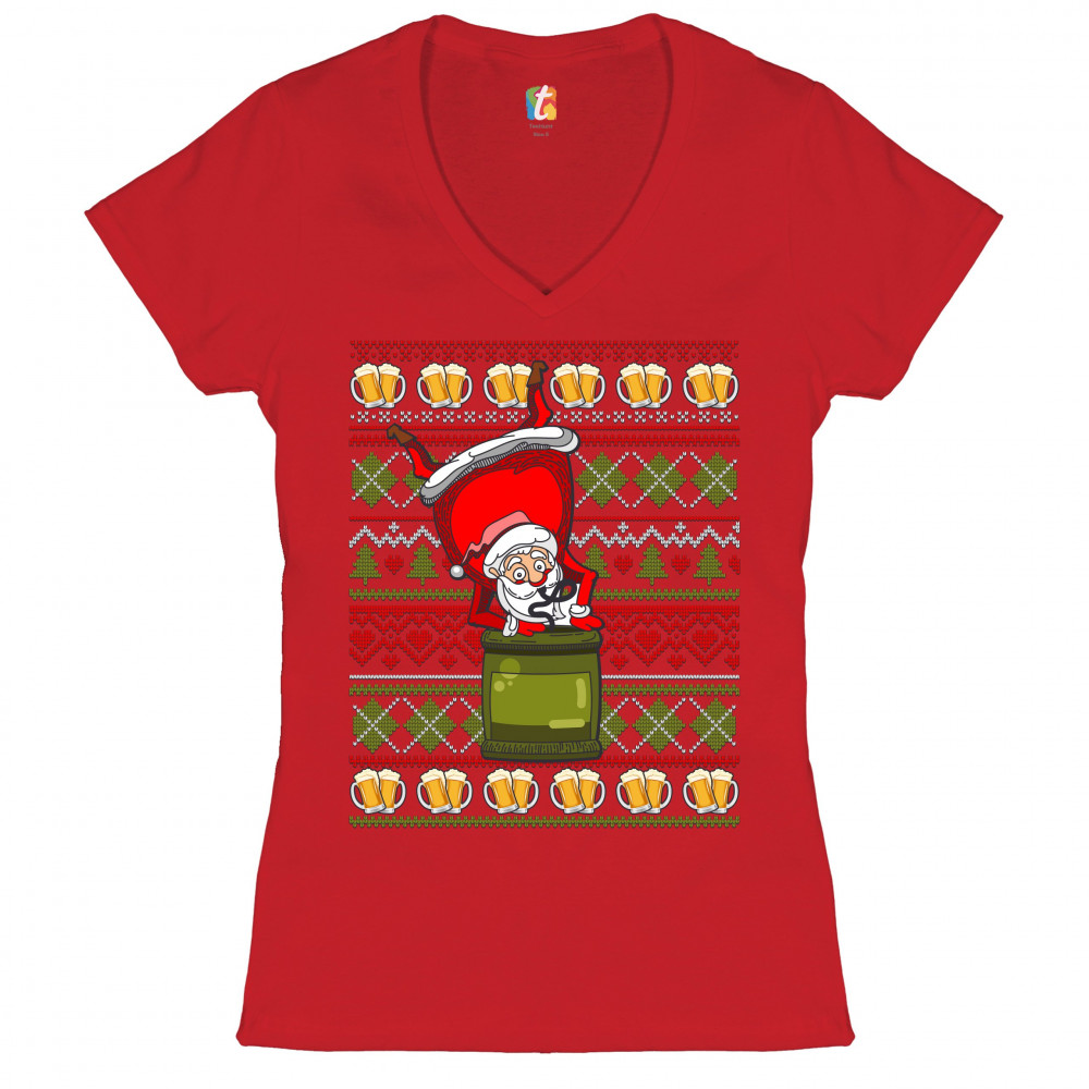 SANTA CLAUS KEG STAND women's v-neck t-shirt christmas ugly sweater beer tee red