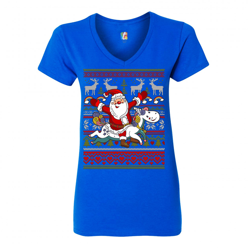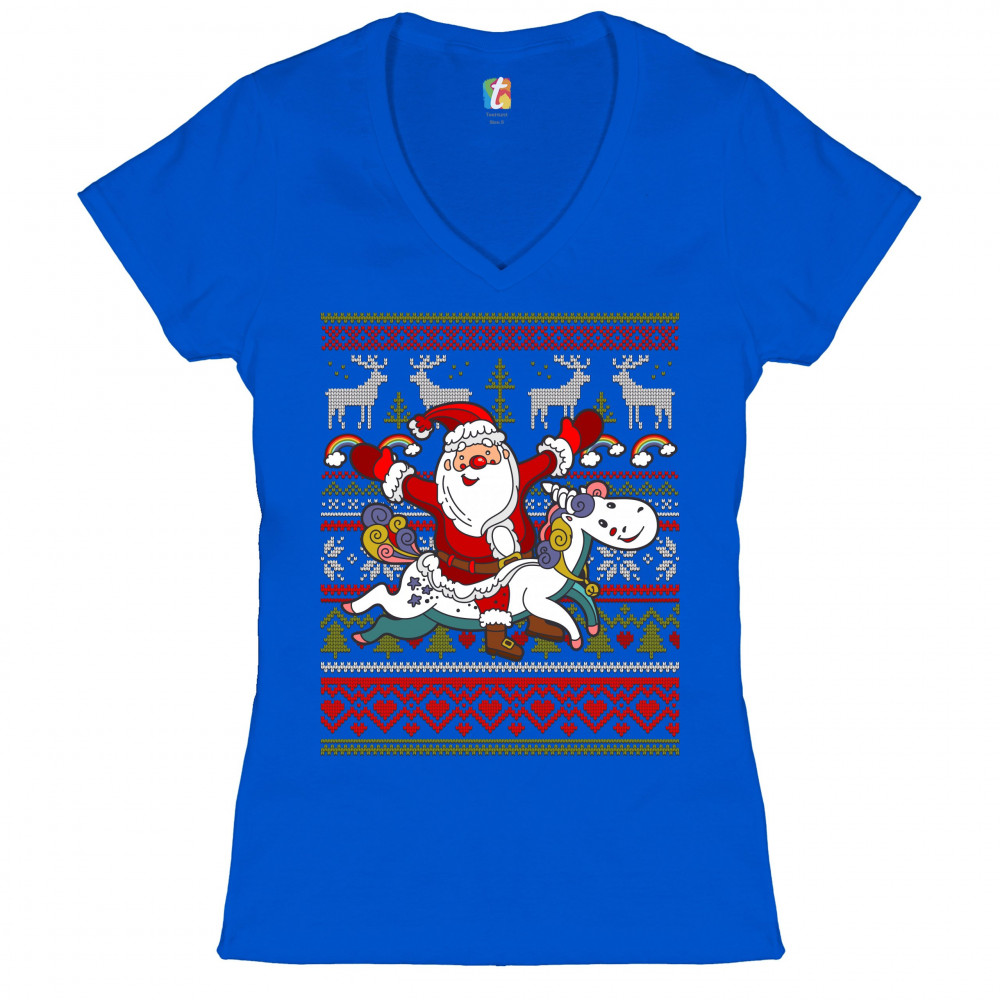 SANTA CLAUS RIDING A UNICORN women's v-neck t-shirt christmas ugly sweater tee royal blue