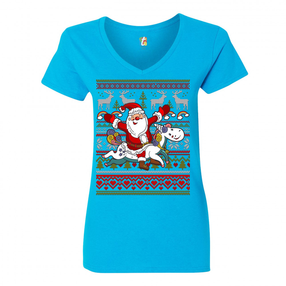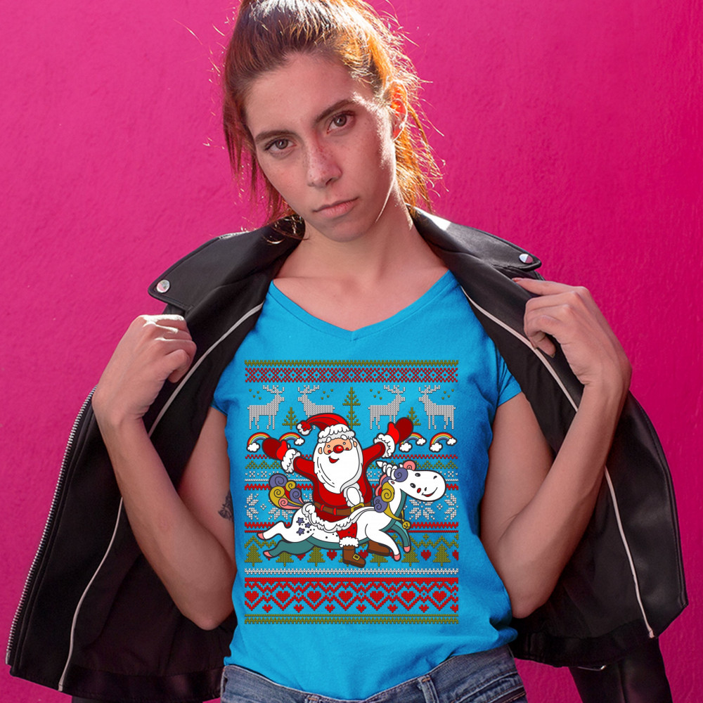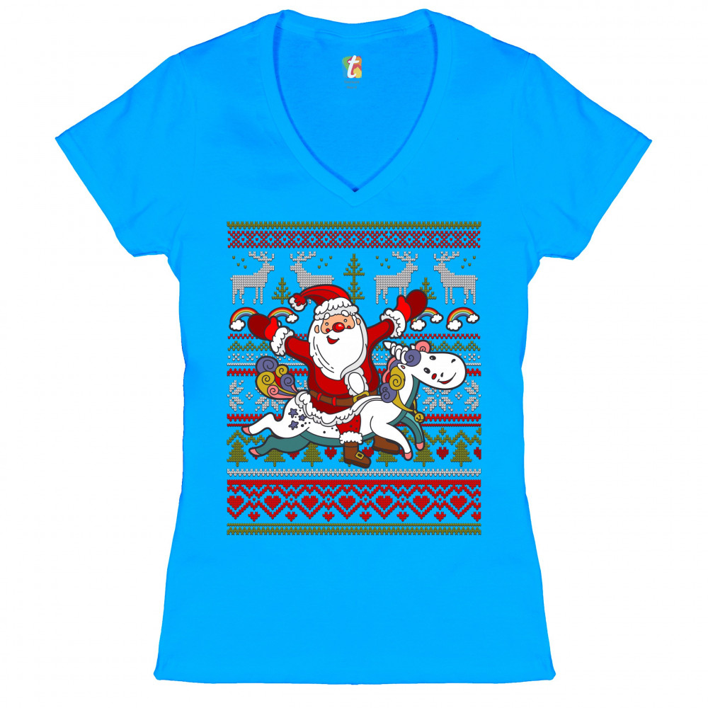 SANTA CLAUS RIDING A UNICORN women's v-neck t-shirt christmas ugly sweater tee turquoise