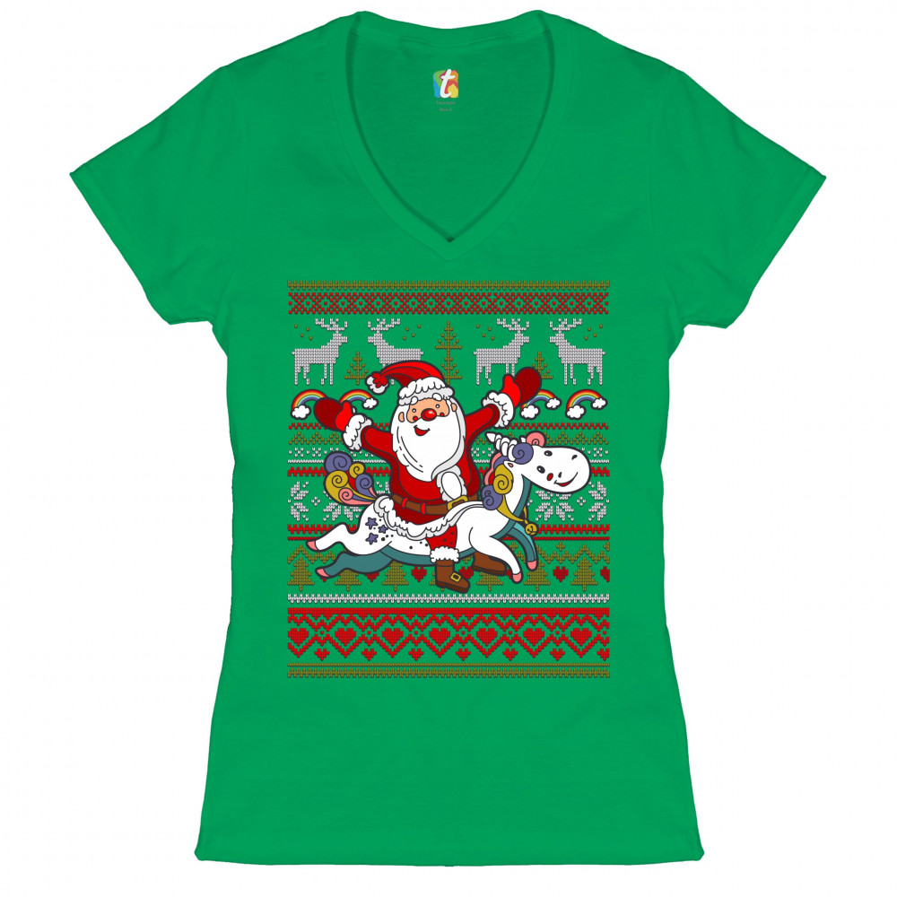 SANTA CLAUS RIDING A UNICORN women's v-neck t-shirt christmas ugly sweater tee green