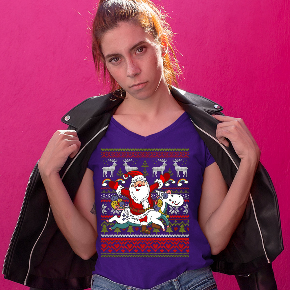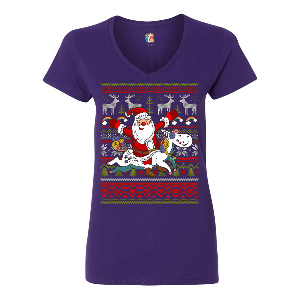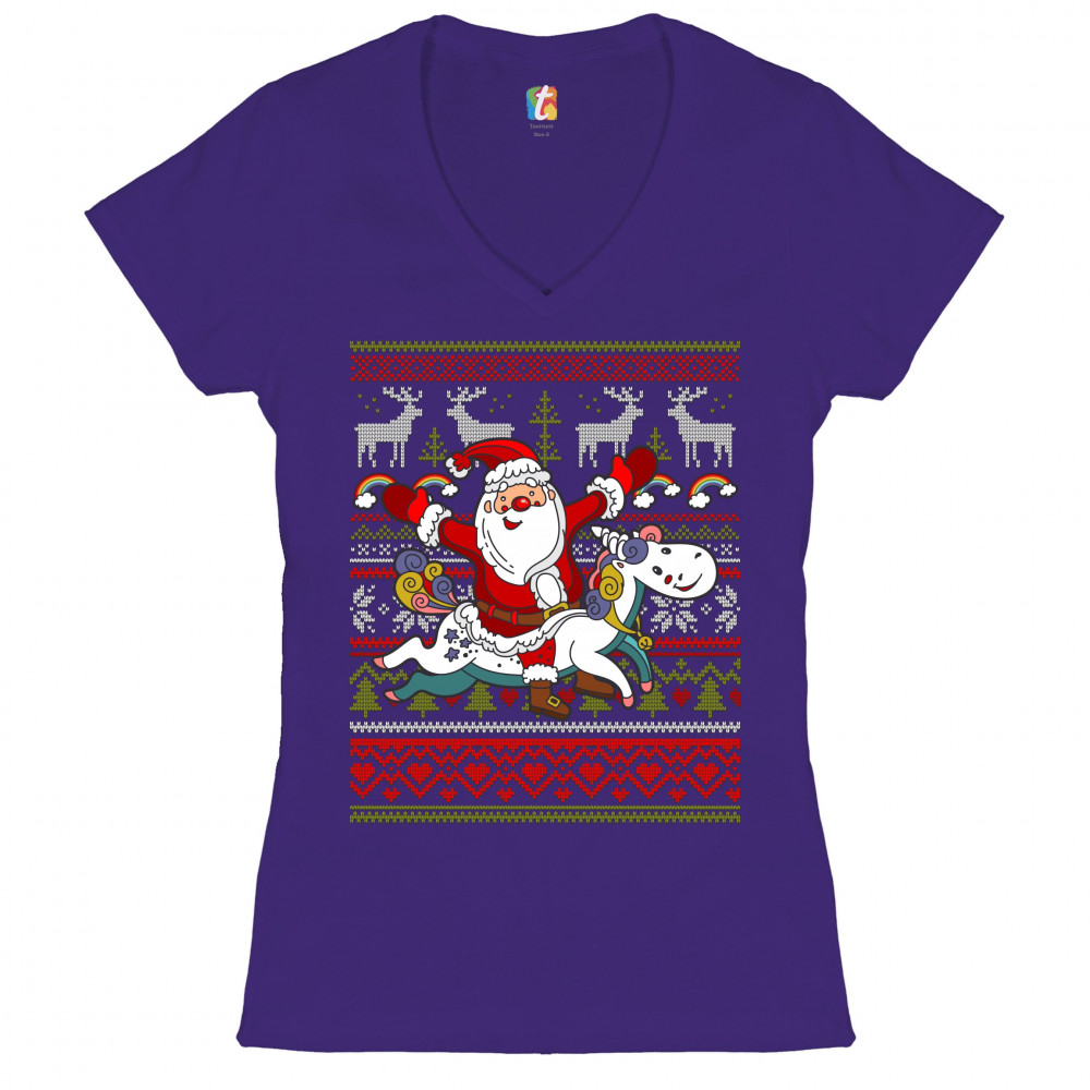 SANTA CLAUS RIDING A UNICORN women's v-neck t-shirt christmas ugly sweater tee purple
