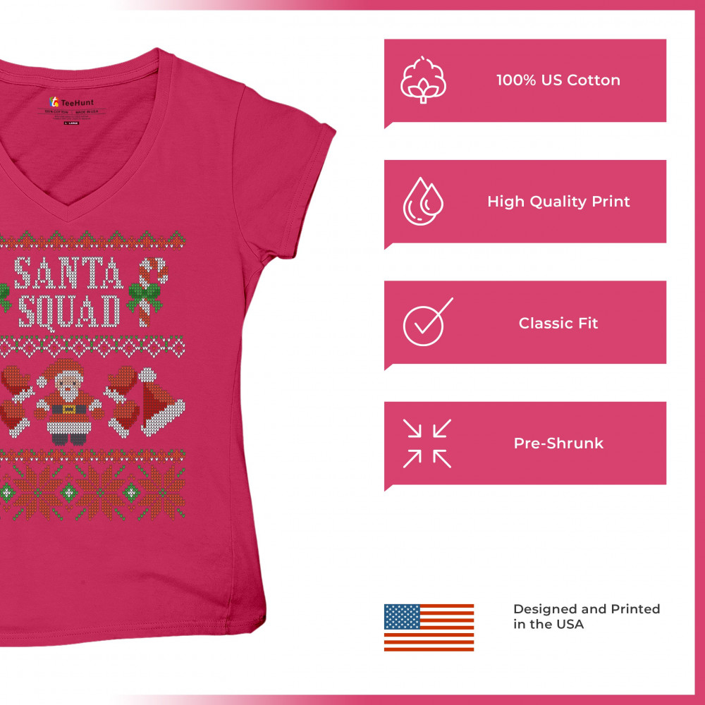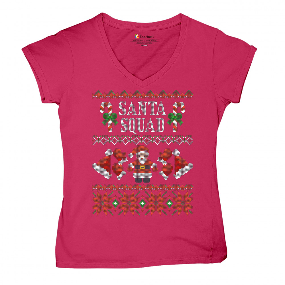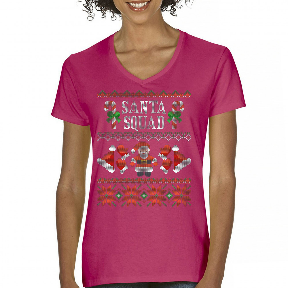 SANTA SQUAD women's v-neck t-shirt ugly sweater merry and bright christmas tee pink