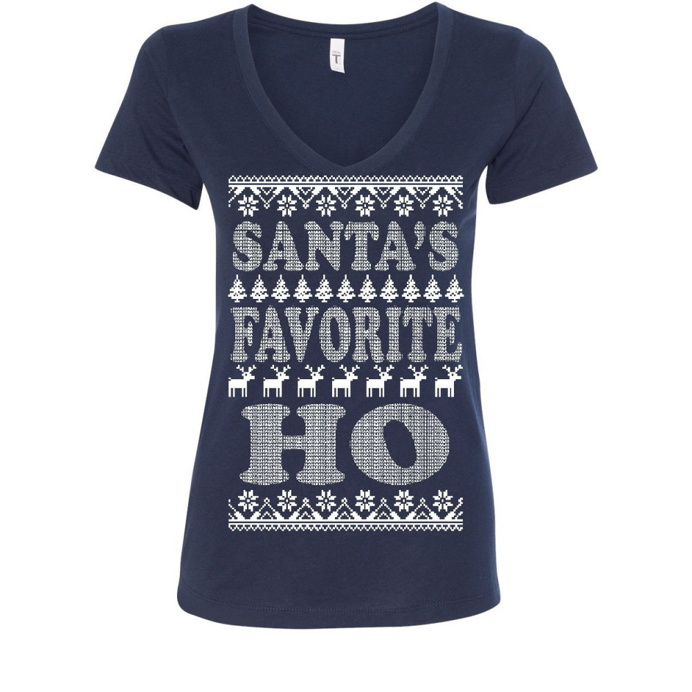 SANTA'S FAVORITE HO women's v-neck t-shirt ugly sweatshirt xmas ho ho ho navy blue
