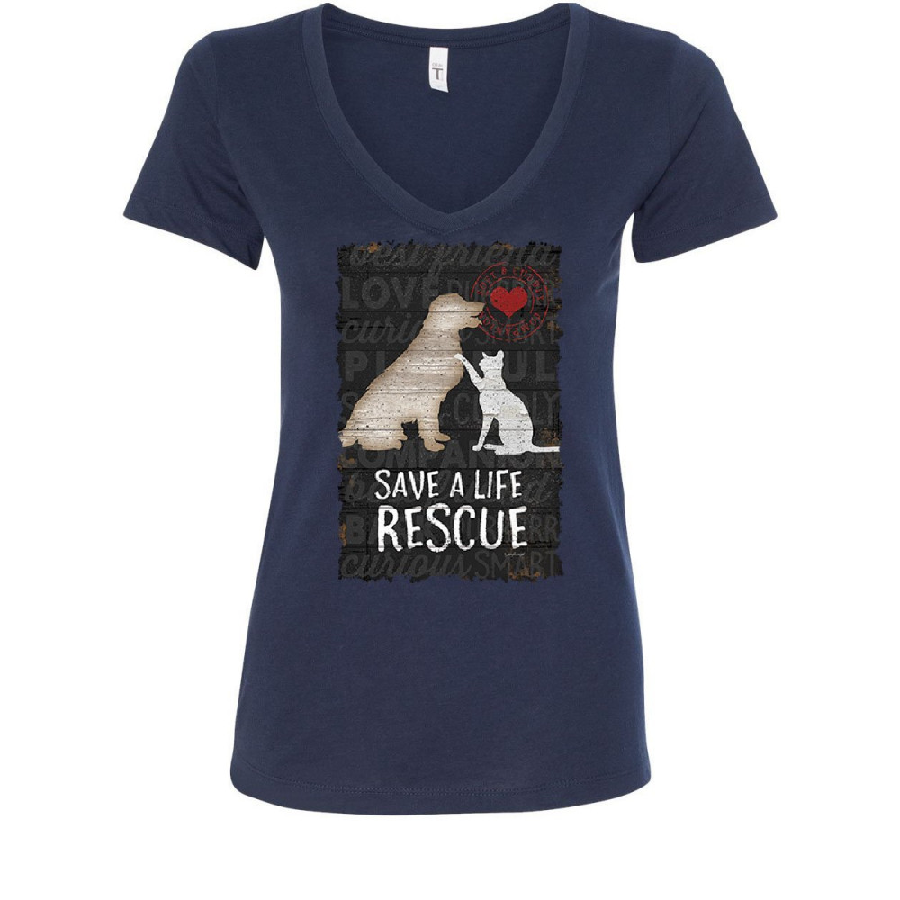 SAVE A LIFE rescue a pet women's v-neck t-shirt dog cat kitty puppy shelter paw navy blue
