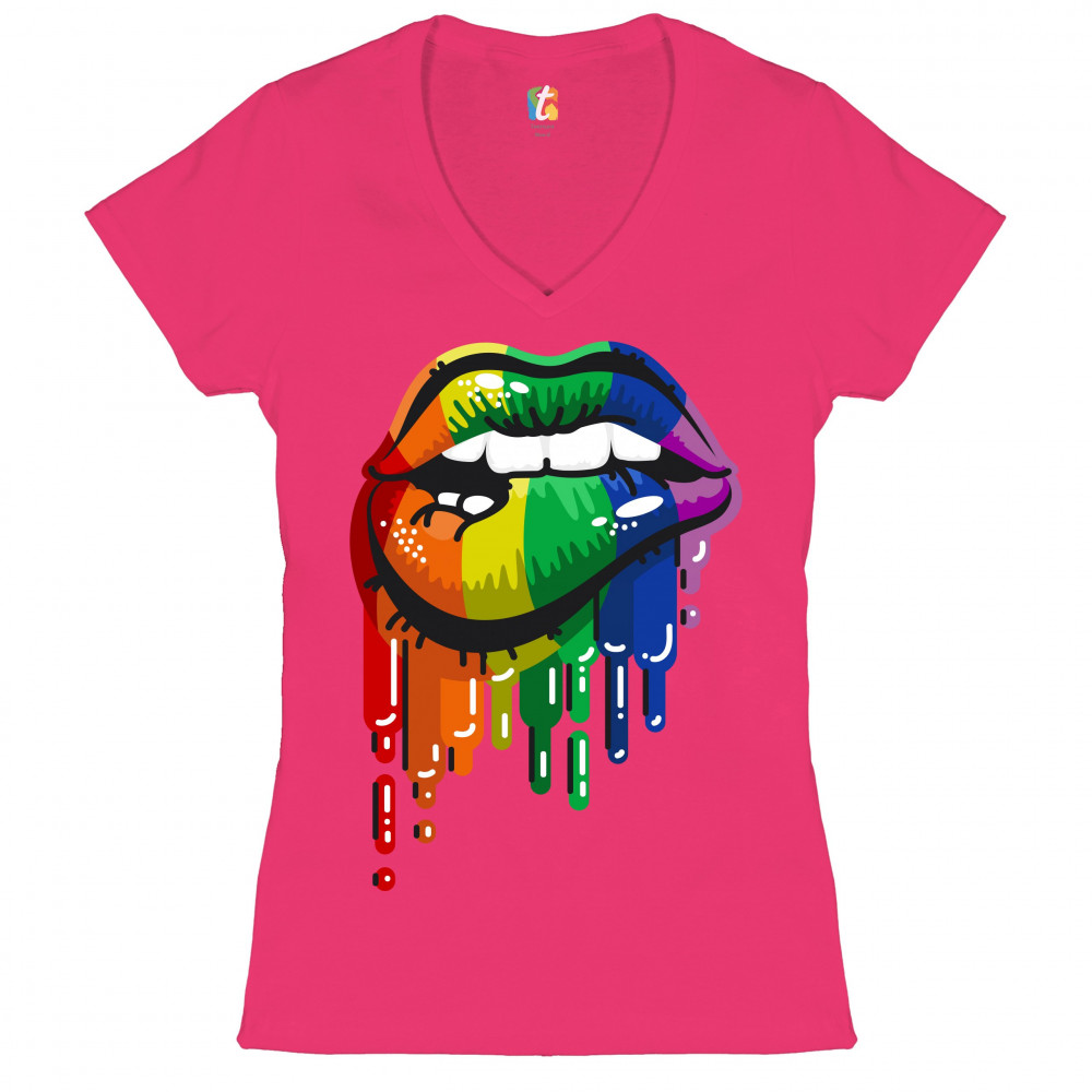 SEXY MELTING RAINBOW LIPS women's v-neck t-shirt lgbt gay pride love wins tee pink