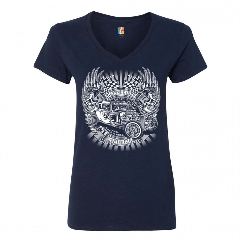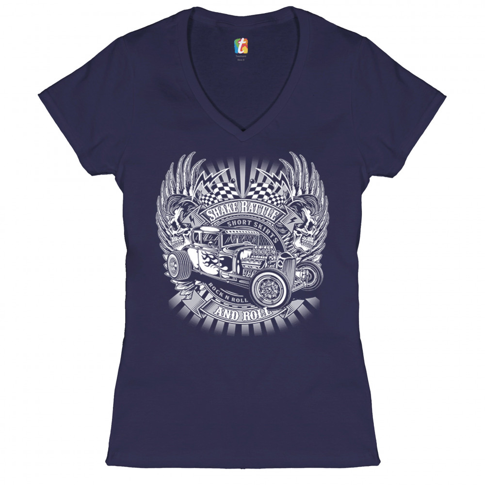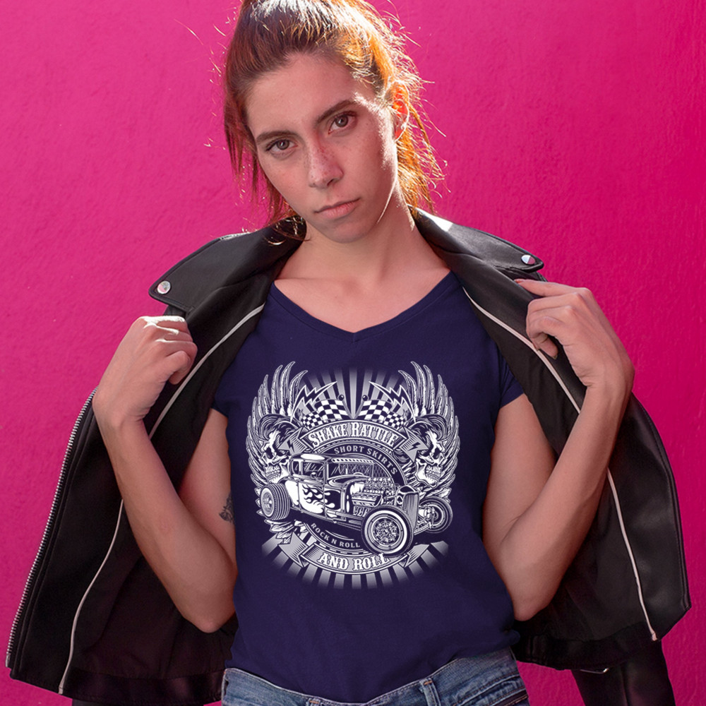 A print featuring a vintage hot rod with an exposed engine, a pair of skulls, wings and racing flags. On several stripes it says: "Shake rattle and roll", "short skirts" and "rock and roll". A great choice for a fan of customized American classic cars and