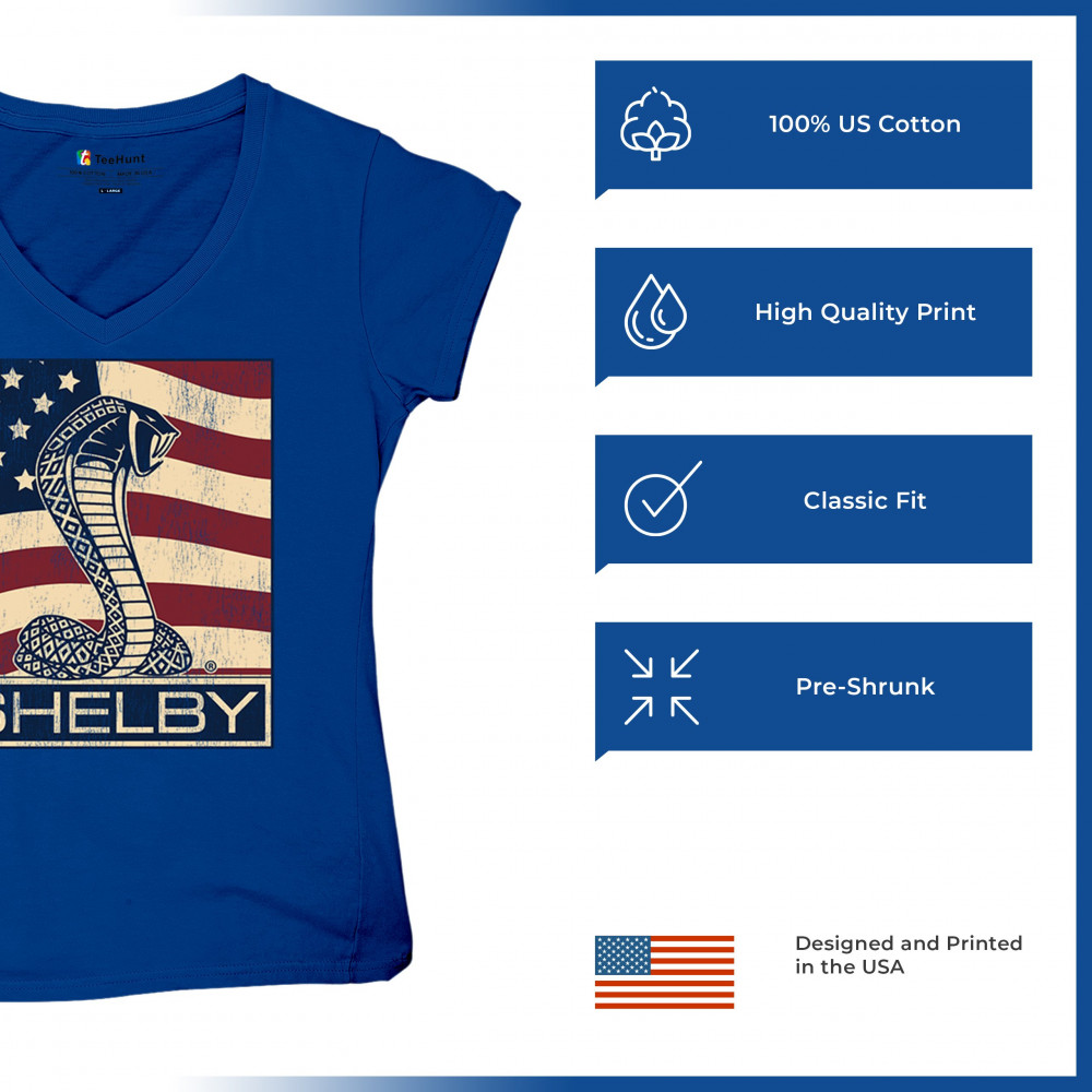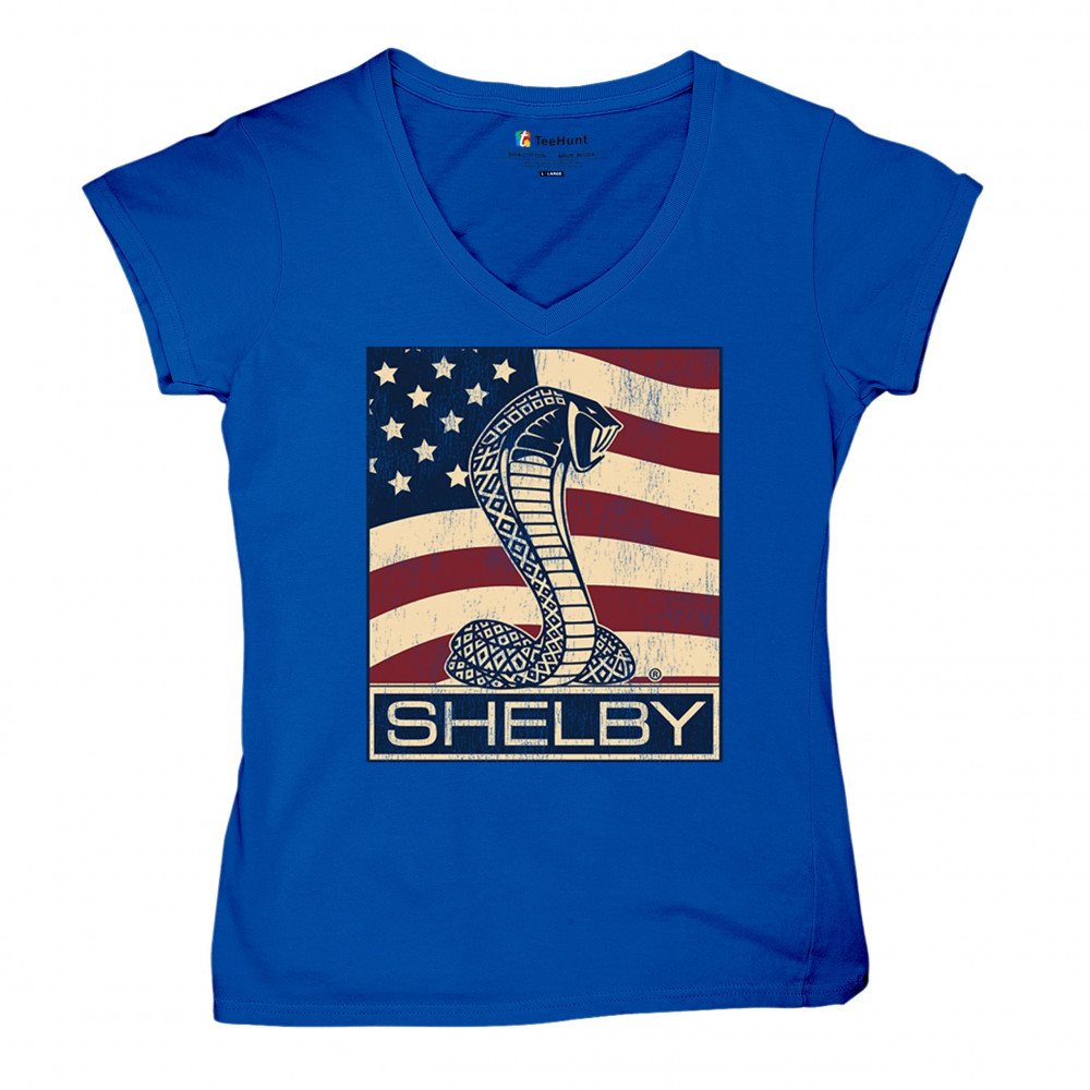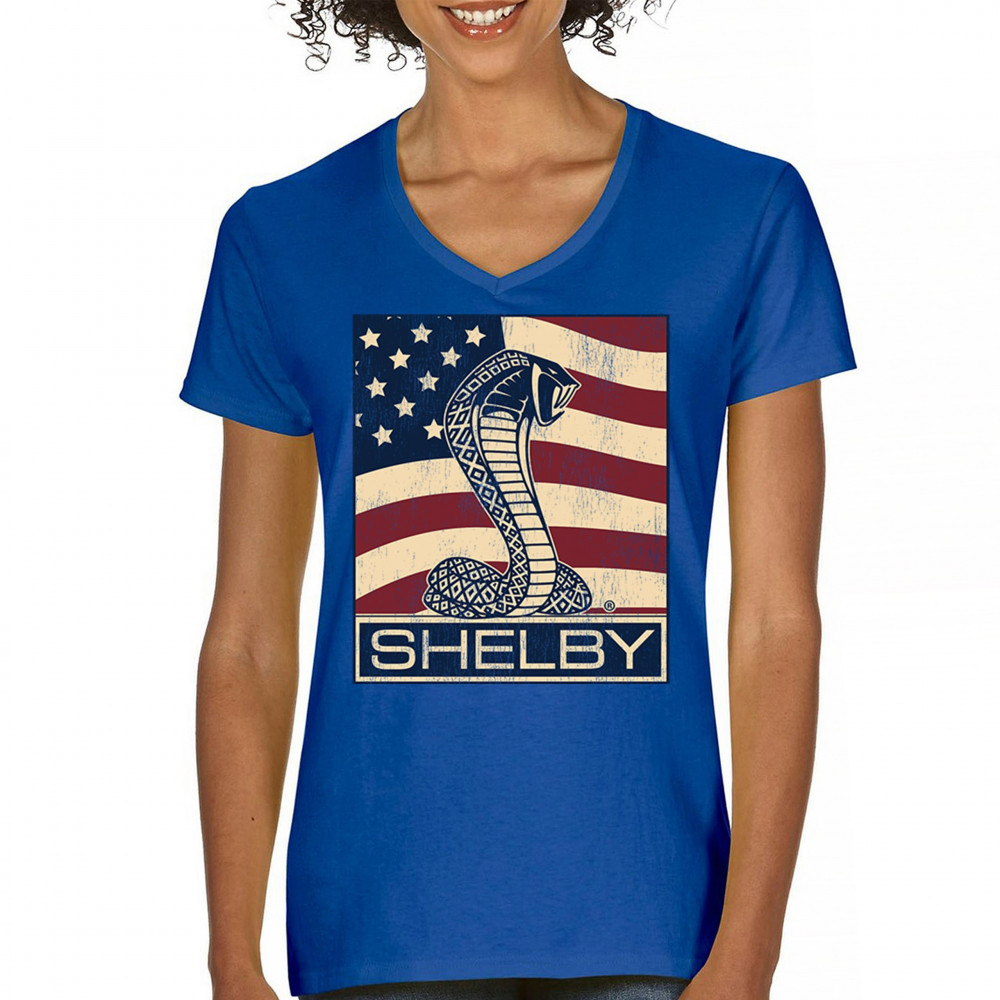 SHELBY COBRA FLAG women's v-neck t-shirt legend mustang gt powered by ford tee royal blue