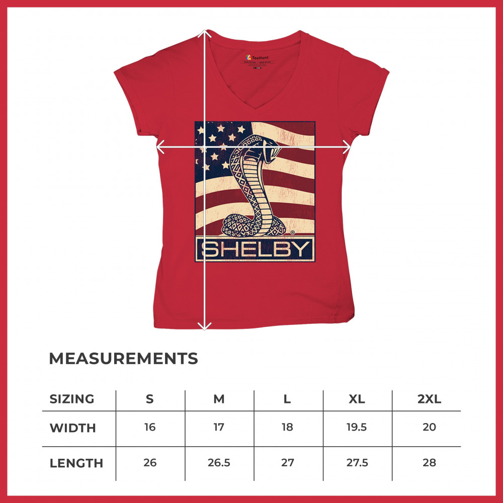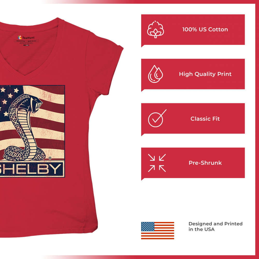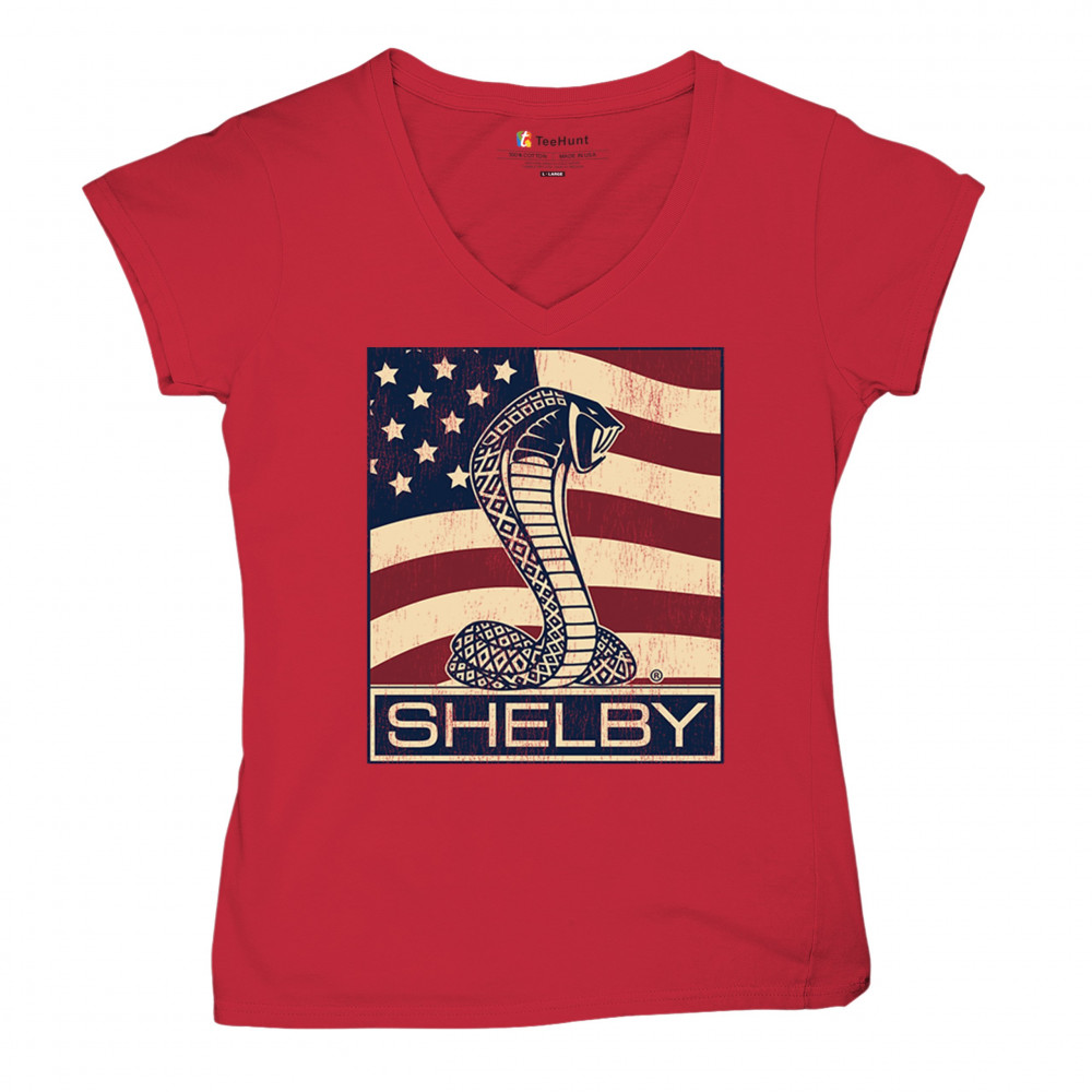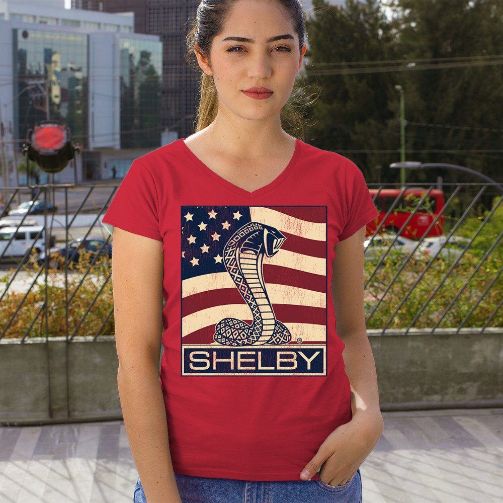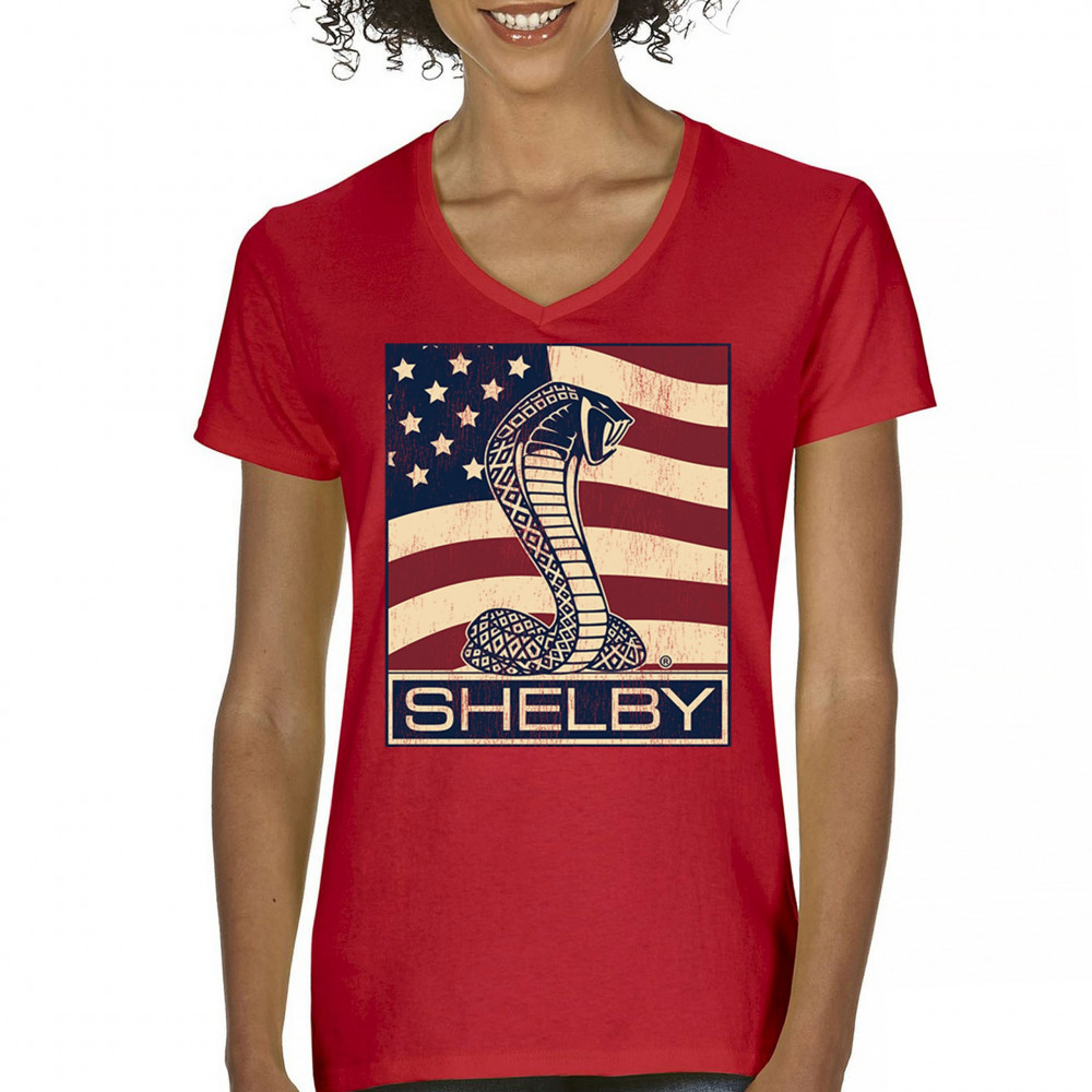 SHELBY COBRA FLAG women's v-neck t-shirt legend mustang gt powered by ford tee red