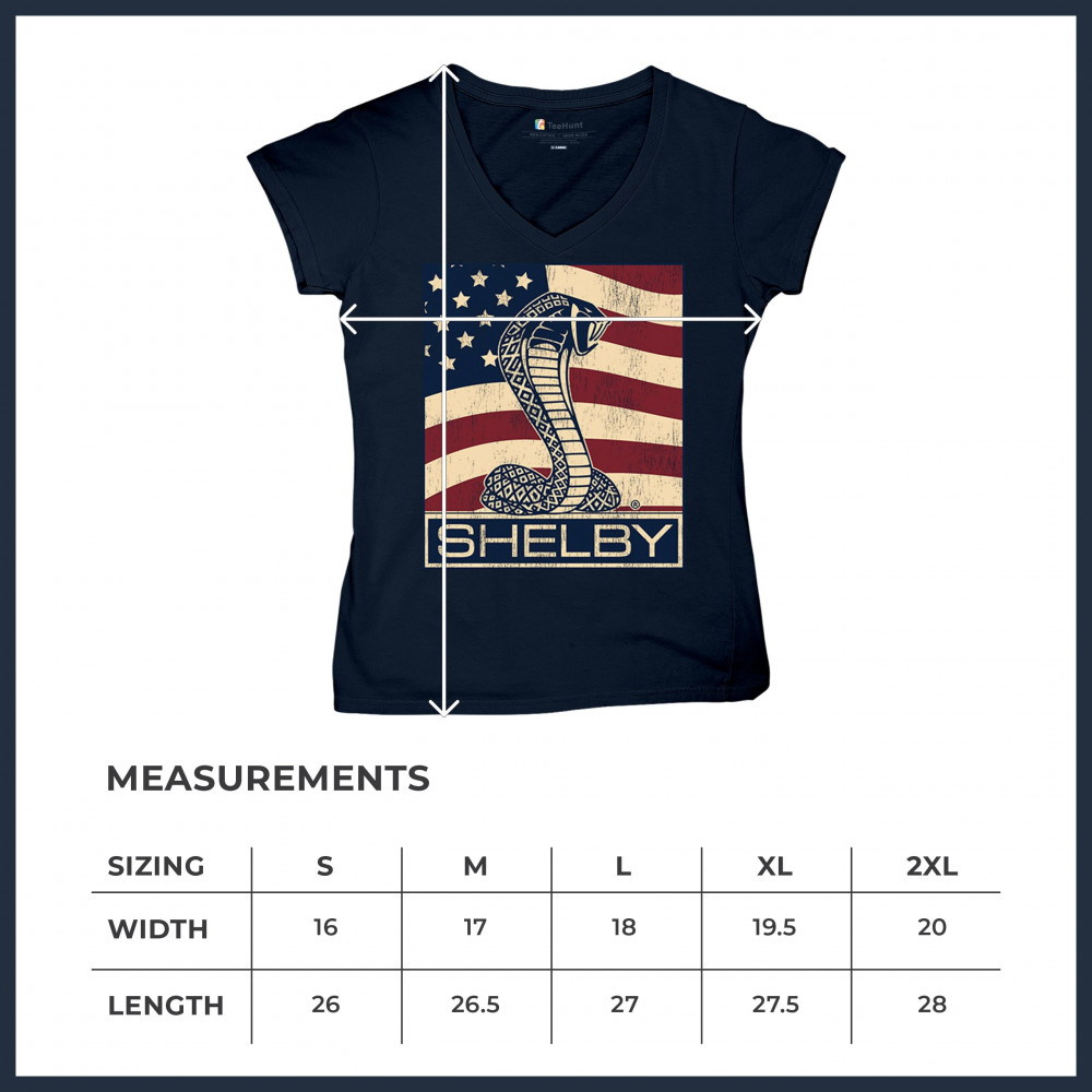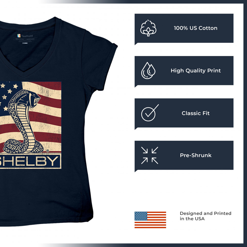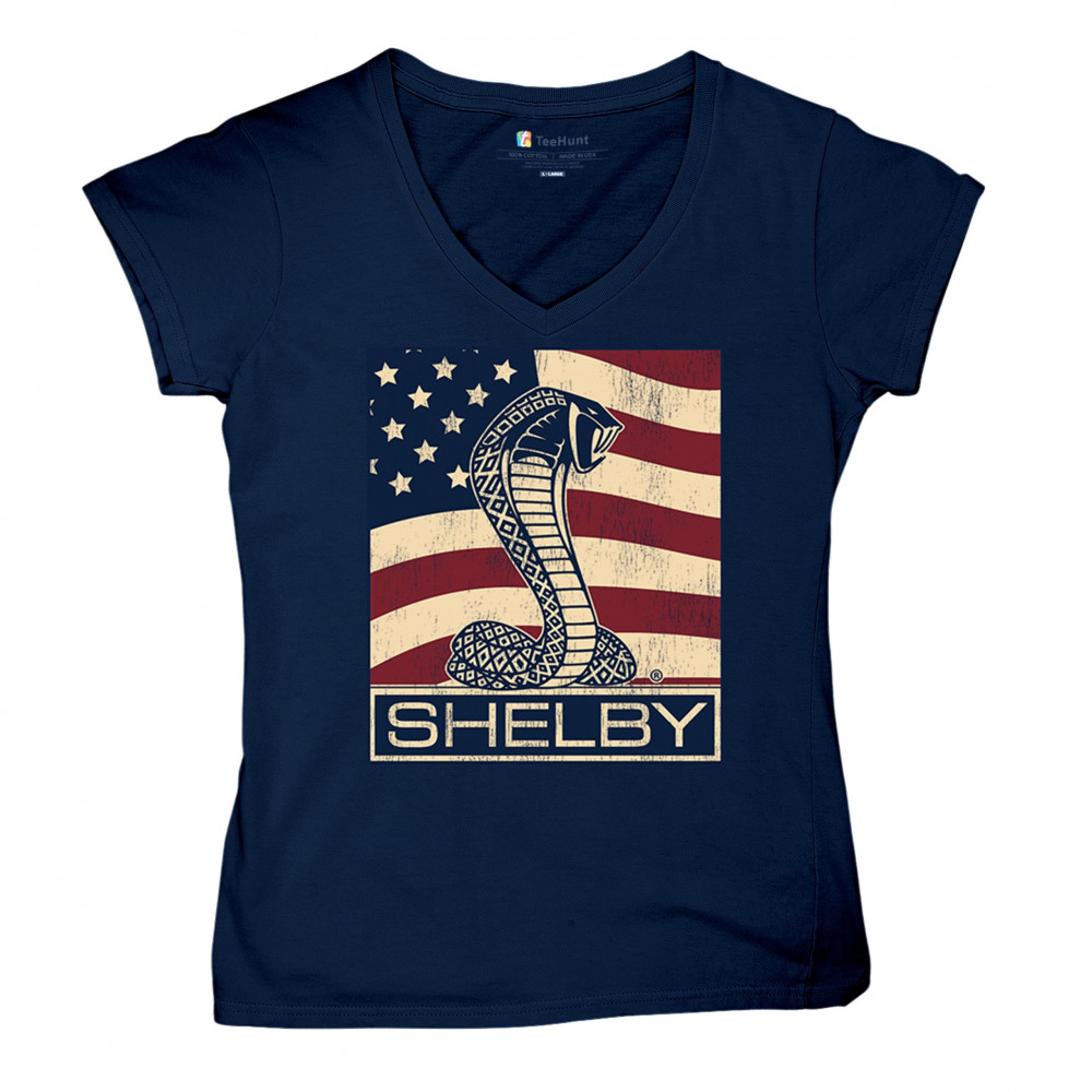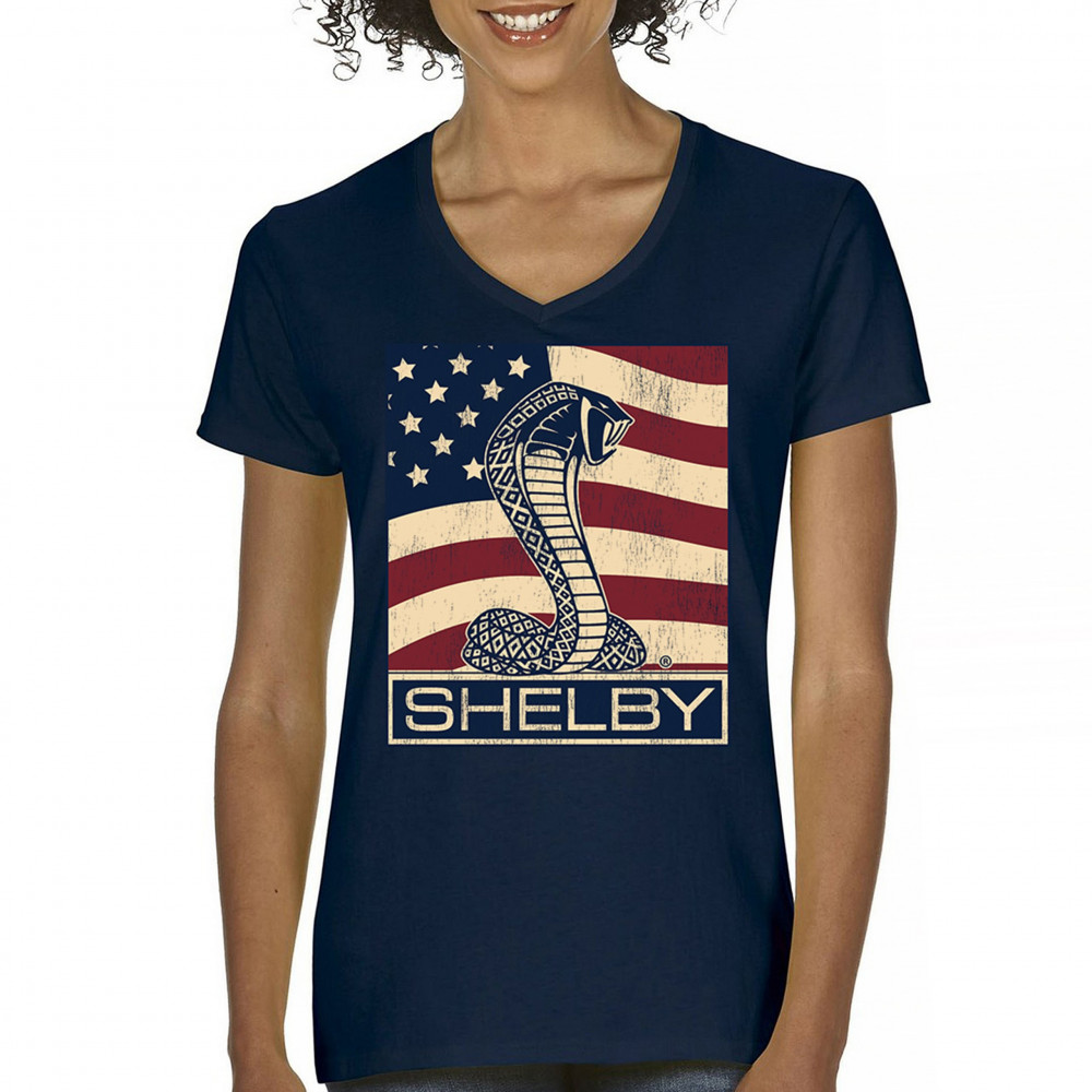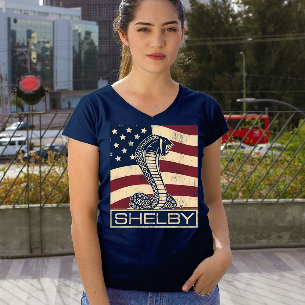 SHELBY COBRA FLAG women's v-neck t-shirt legend mustang gt powered by ford tee navy blue