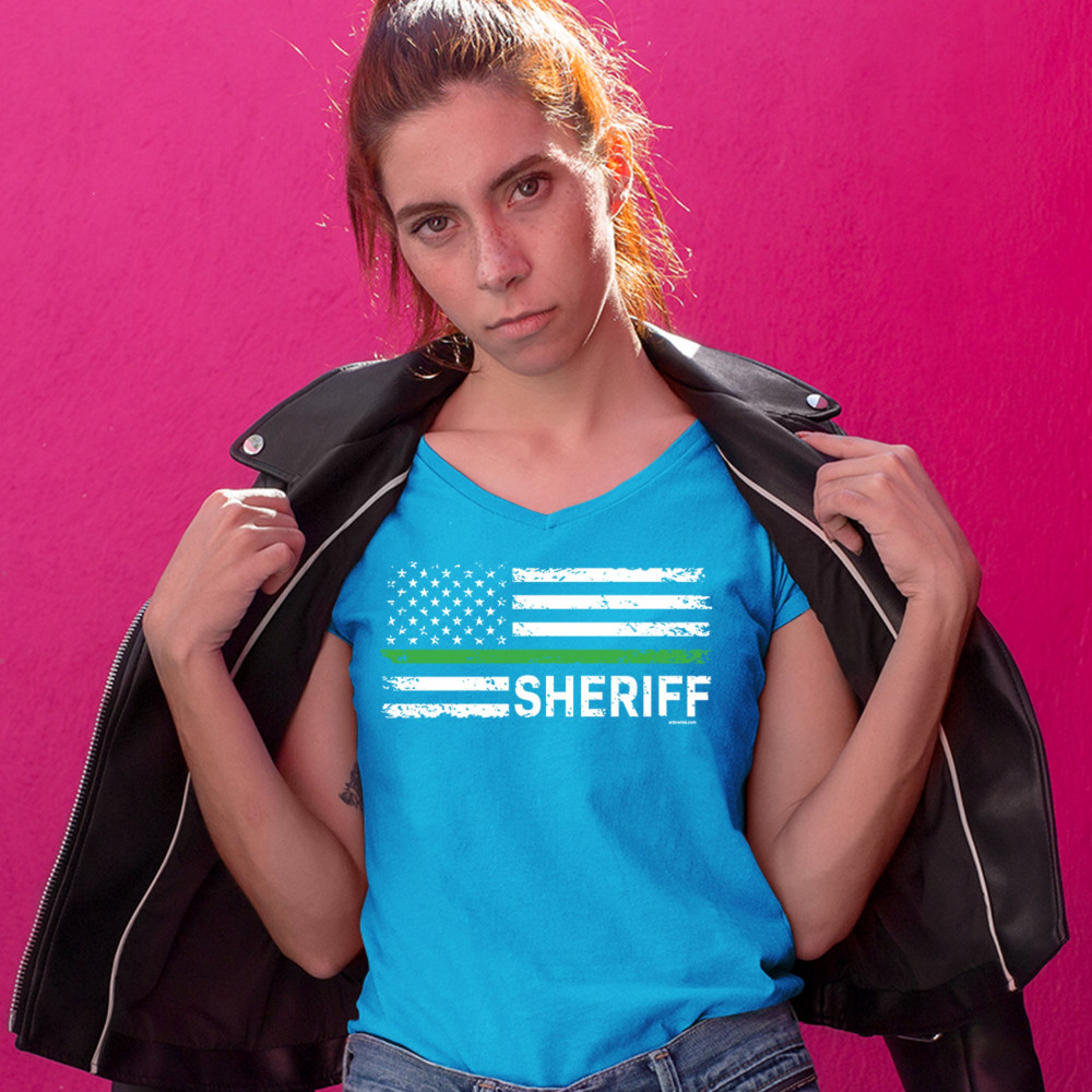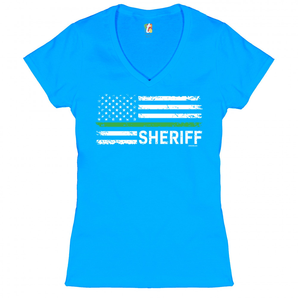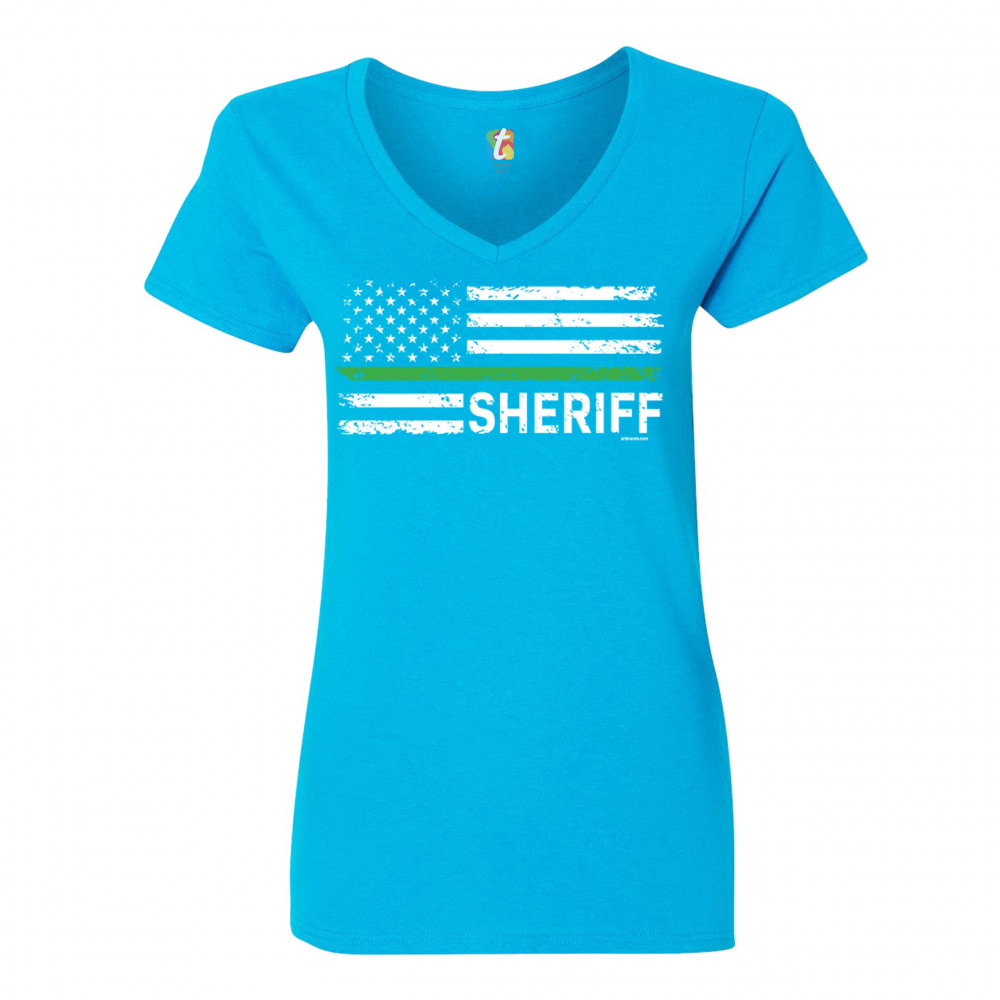 SHERIFF DISTRESSED AMERICAN FLAG women's v-neck t-shirt first responders tee turquoise