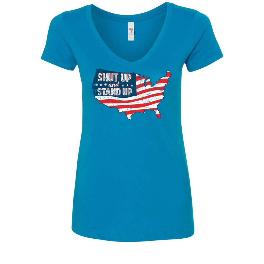 SHUT UP AND STAND UP women's v-neck t-shirt anthem usa map maga flag patriotic turquoise