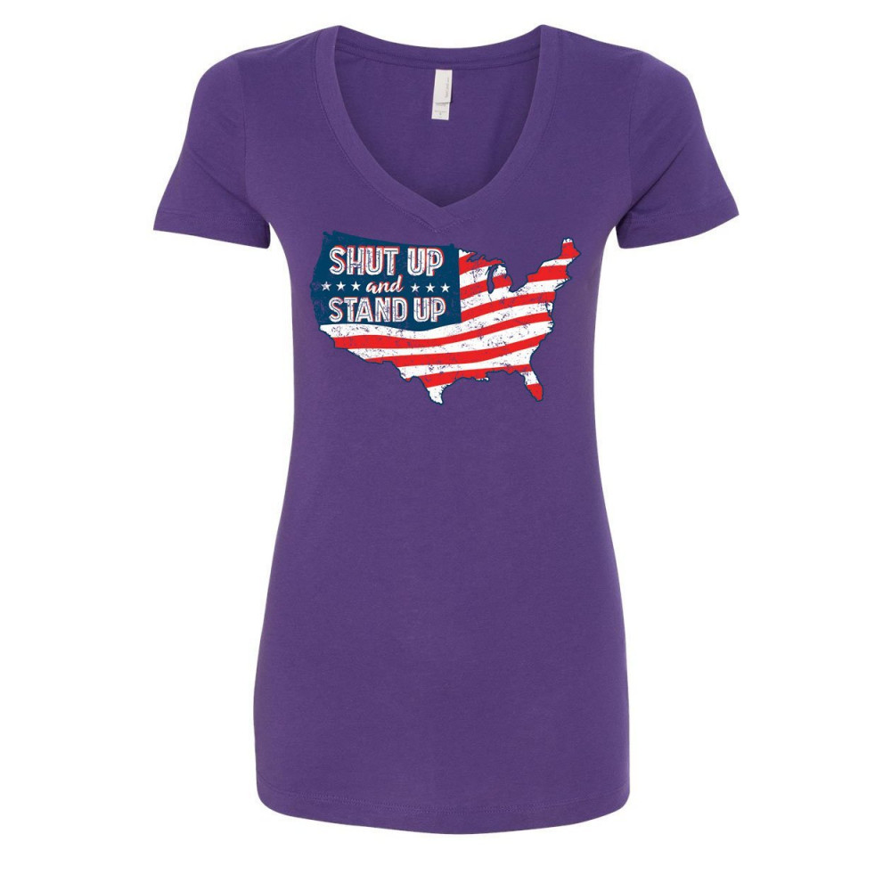 SHUT UP AND STAND UP women's v-neck t-shirt anthem usa map maga flag patriotic purple