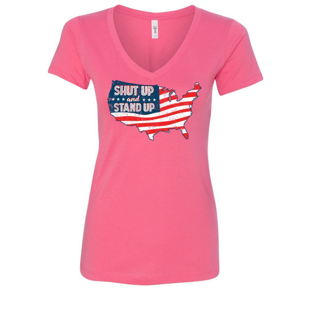 SHUT UP AND STAND UP women's v-neck t-shirt anthem usa map maga flag patriotic pink