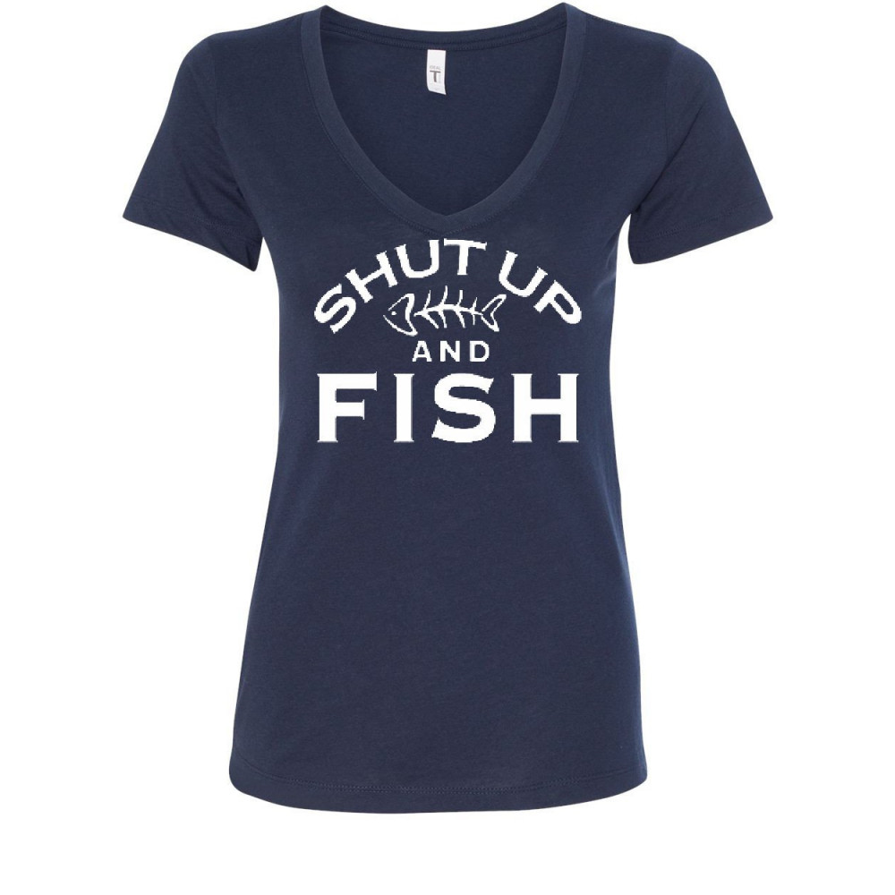 SHUT UP AND FISH v-neck t-shirt funny fishing navy blue