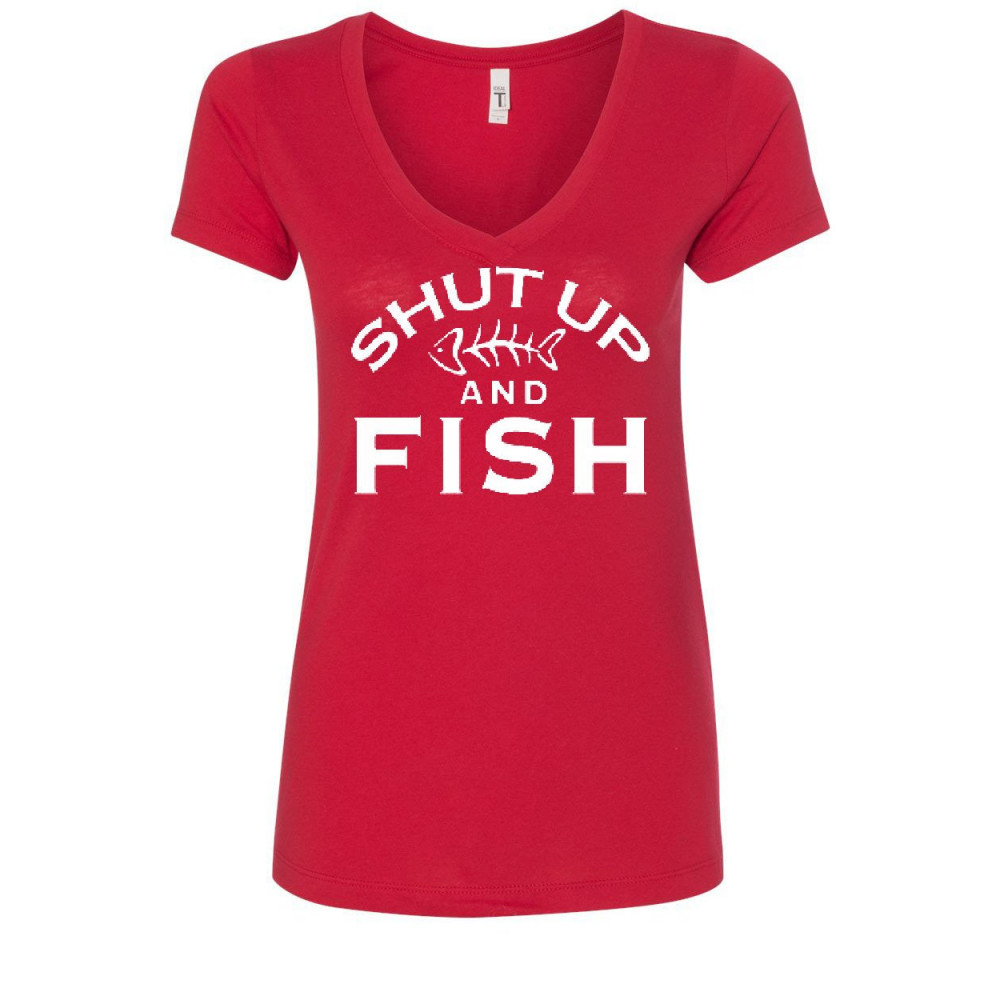SHUT UP AND FISH v-neck t-shirt funny fishing red
