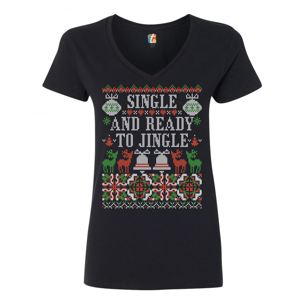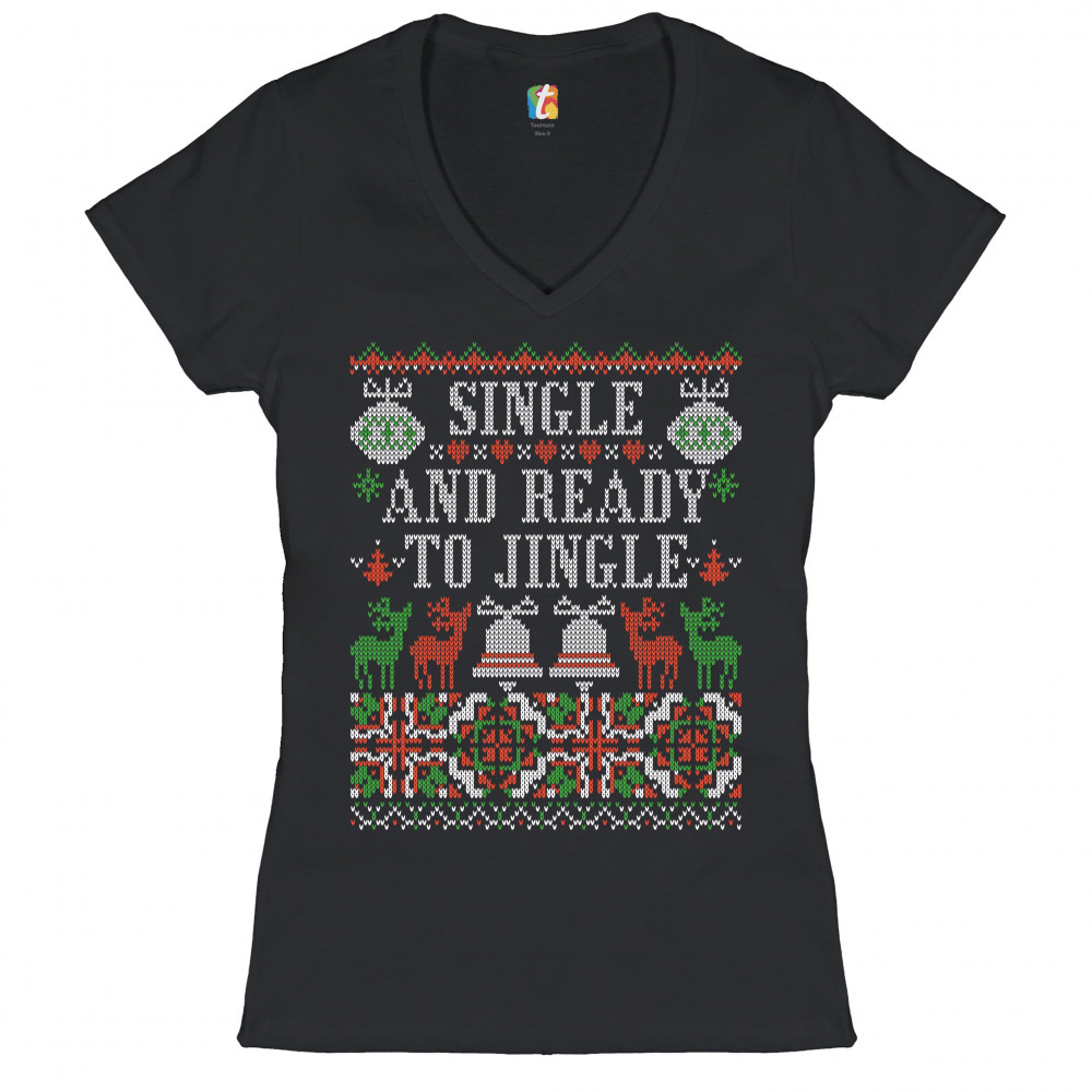 A print saying: "Single and Ready to Jingle" and featuring four reindeers and two Christmas bells. The print is designed as an ugly sweater. Amazing choice for a single person who wants to make people smile and spread positive vibes on Christmas Eve.