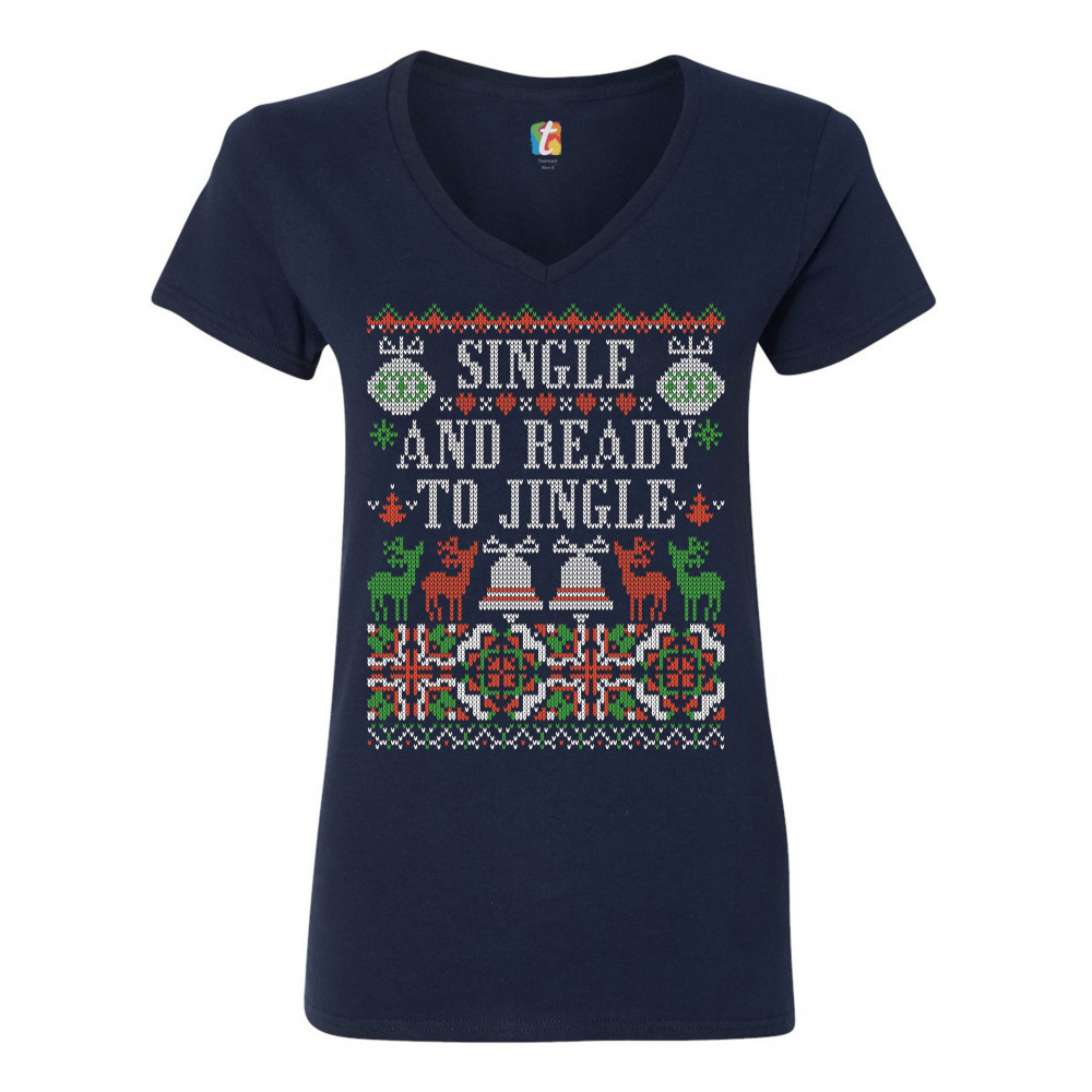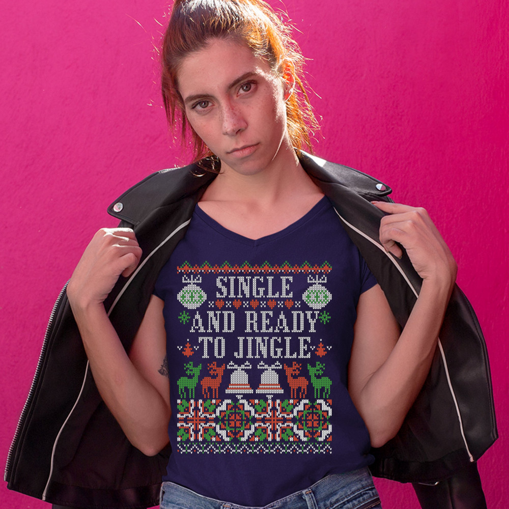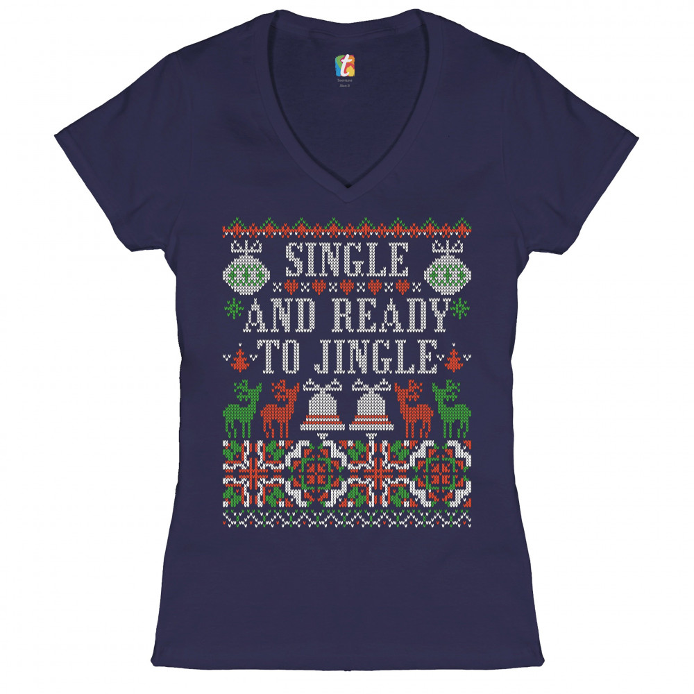 SINGLE AND READY TO JINGLE women's v-neck t-shirt christmas ugly sweater tee navy blue