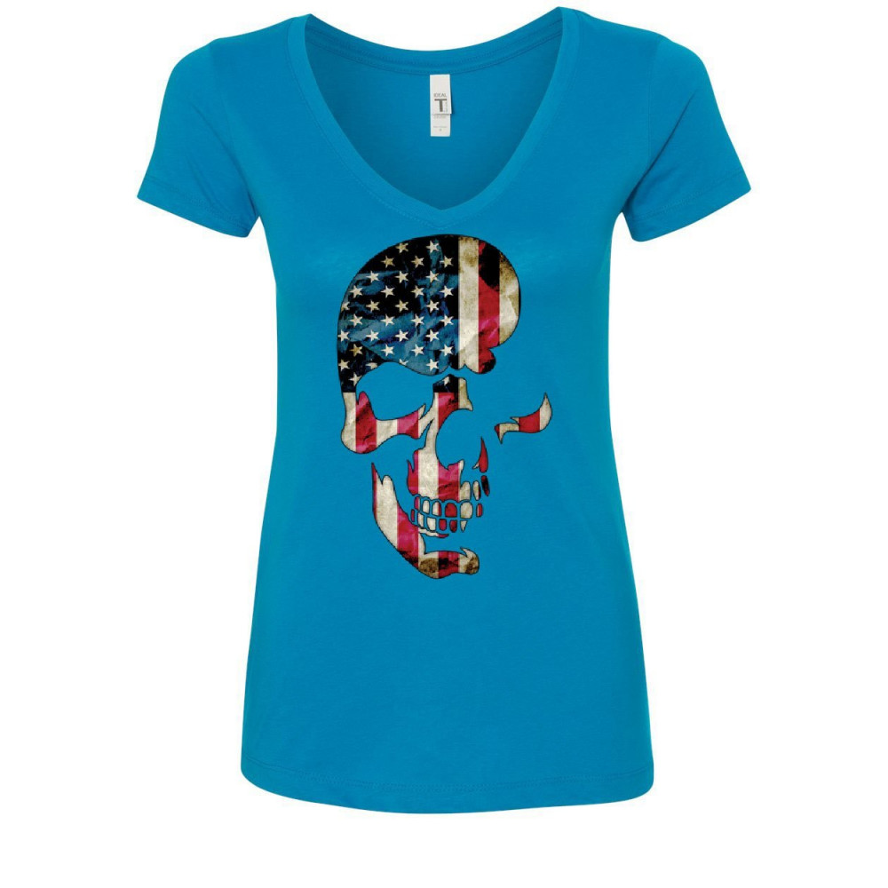 SKULL AMERICANA women's v-neck t-shirt patriotic 4th of july stars and stripes turquoise