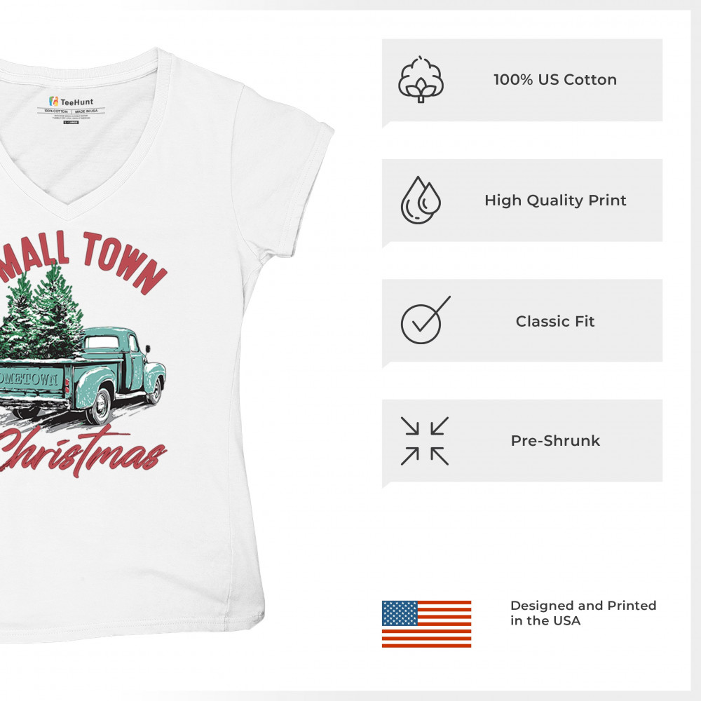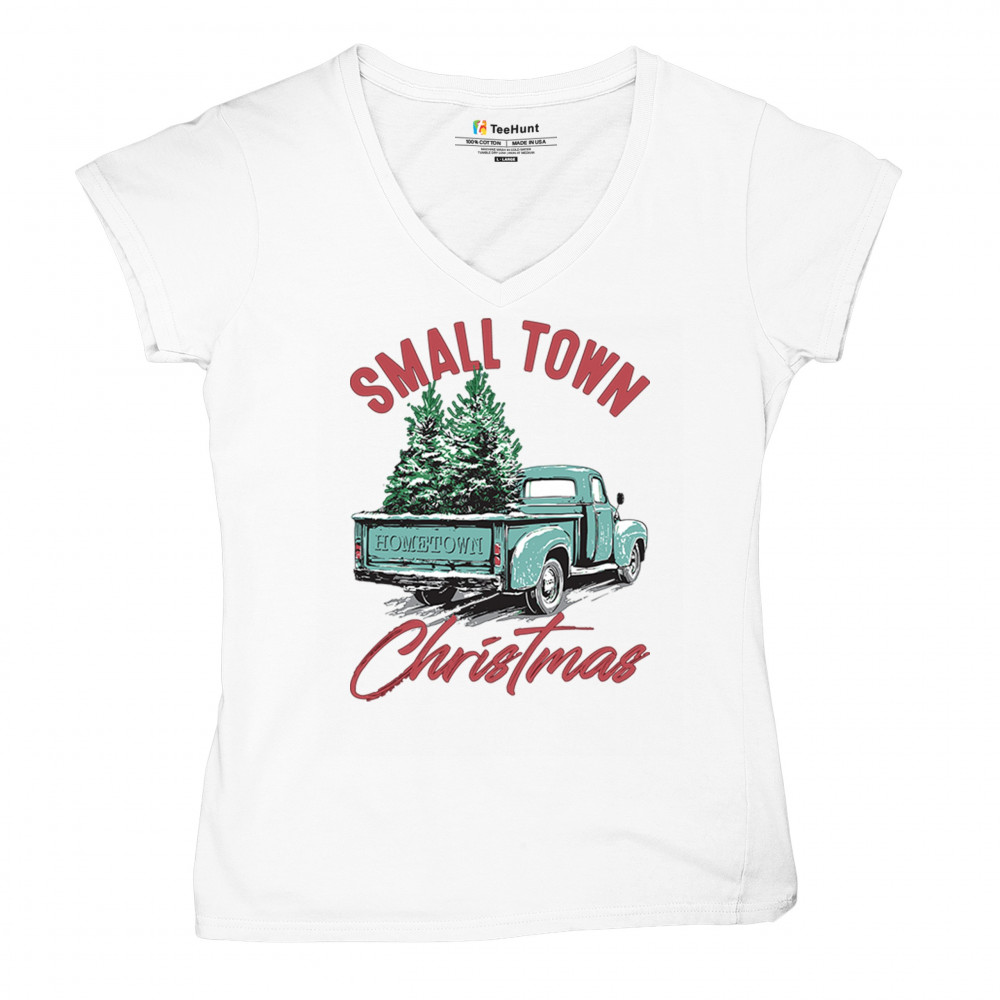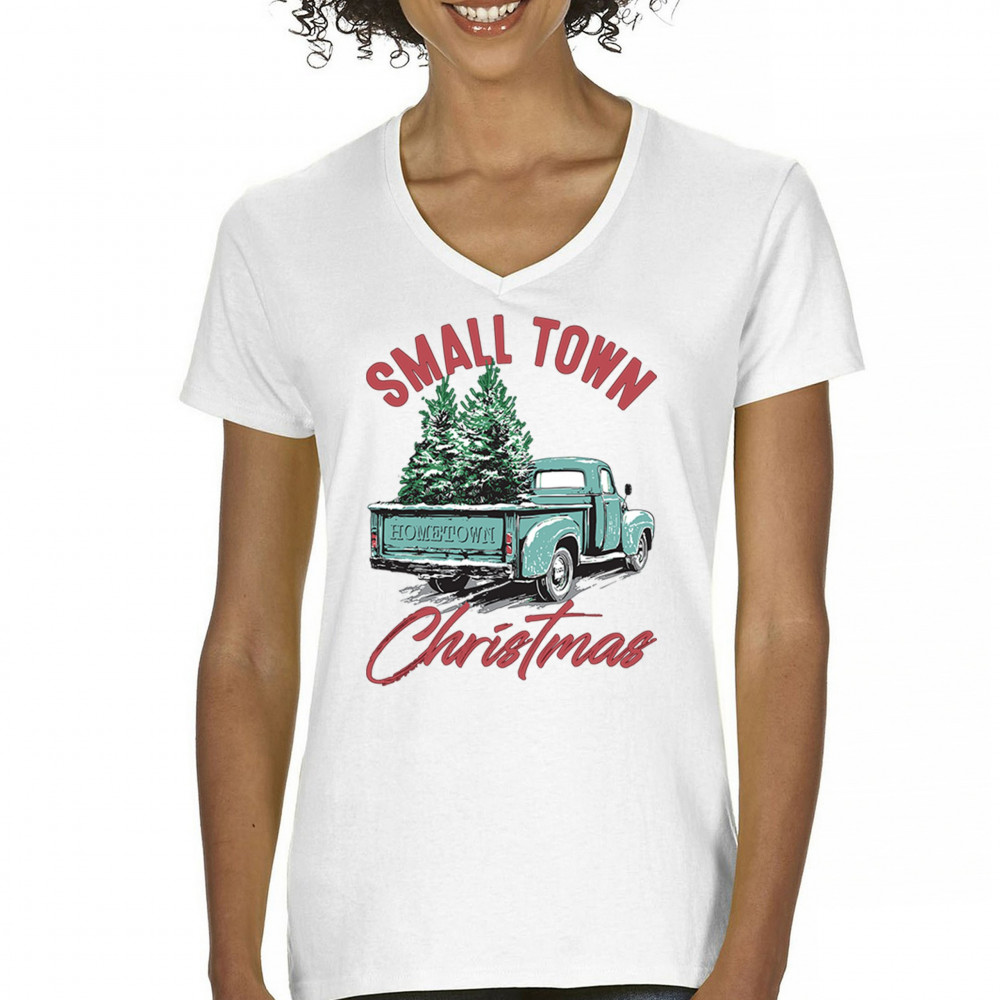 Embrace holiday nostalgia with this "Small Town Christmas" design featuring a vintage truck and Christmas trees. Perfect for rustic decor lovers.