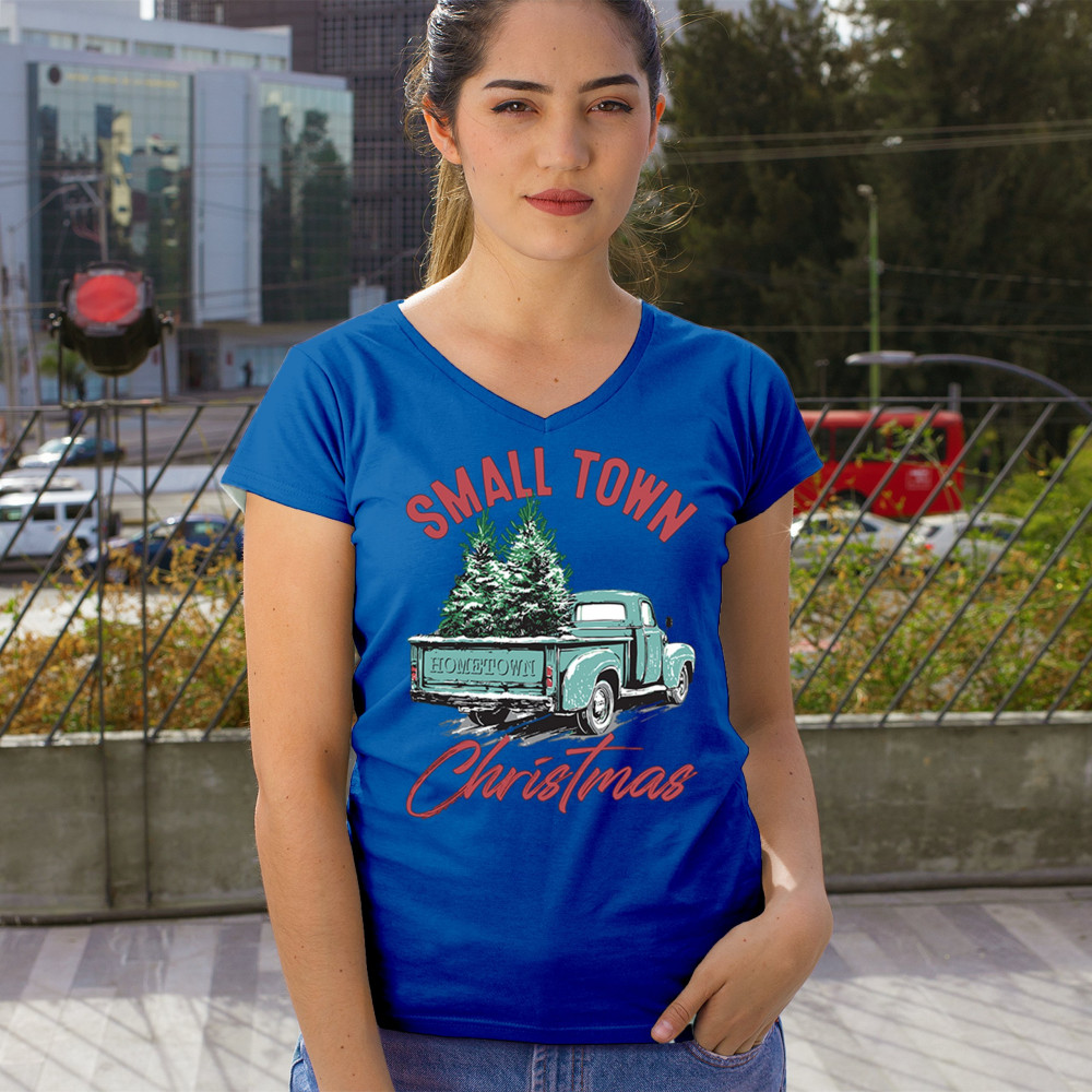Embrace holiday nostalgia with this "Small Town Christmas" design featuring a vintage truck and Christmas trees. Perfect for rustic decor lovers.
