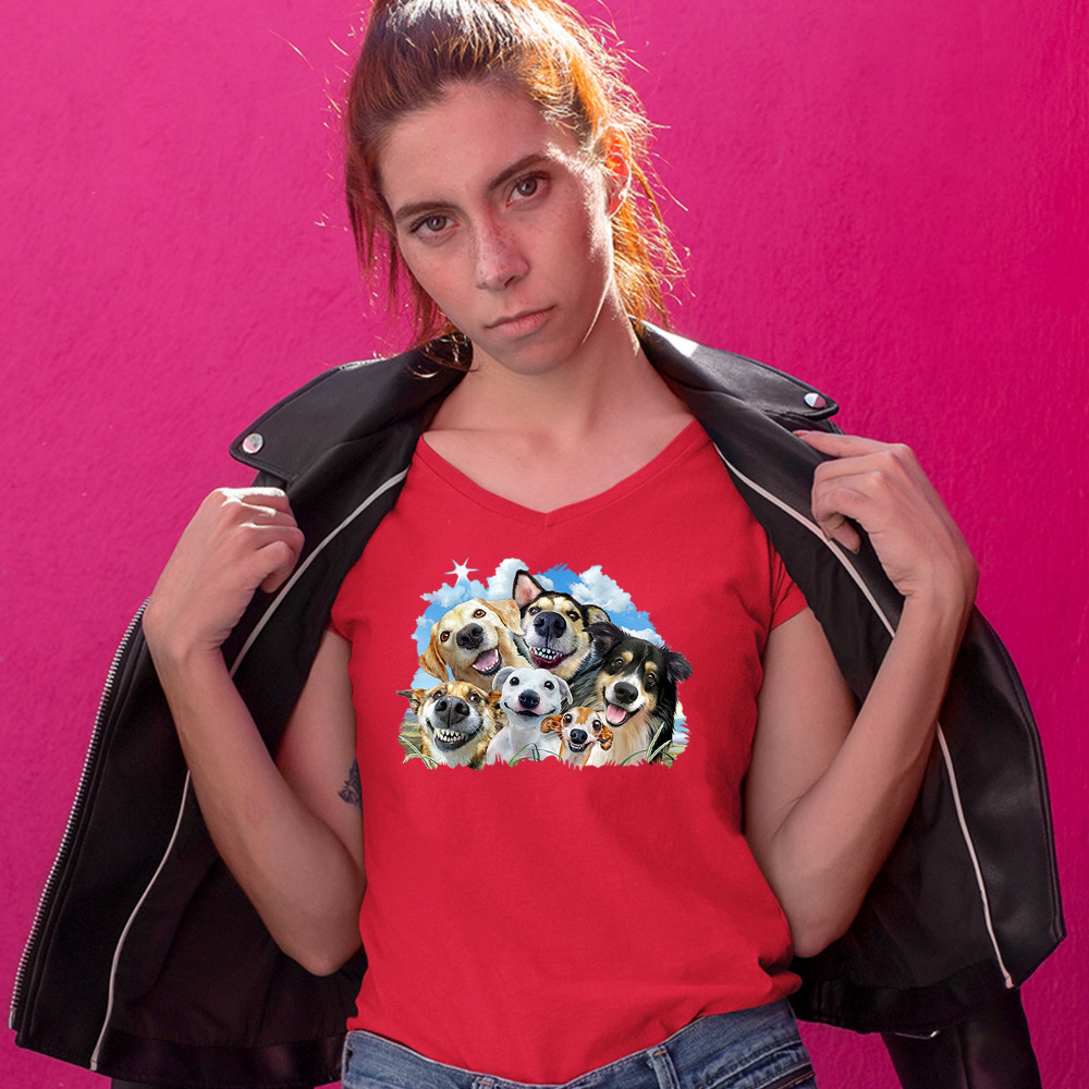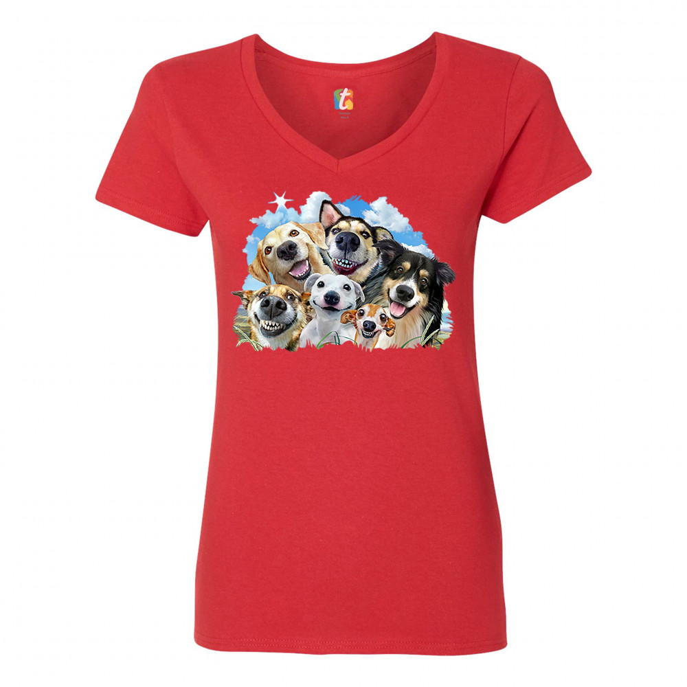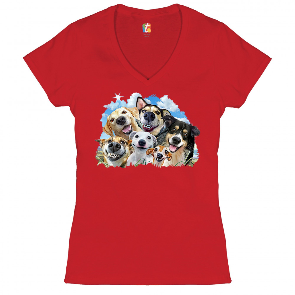 SMILING DOGS' SELFIE women's v-neck t-shirt funny animal dog lover cute tee red