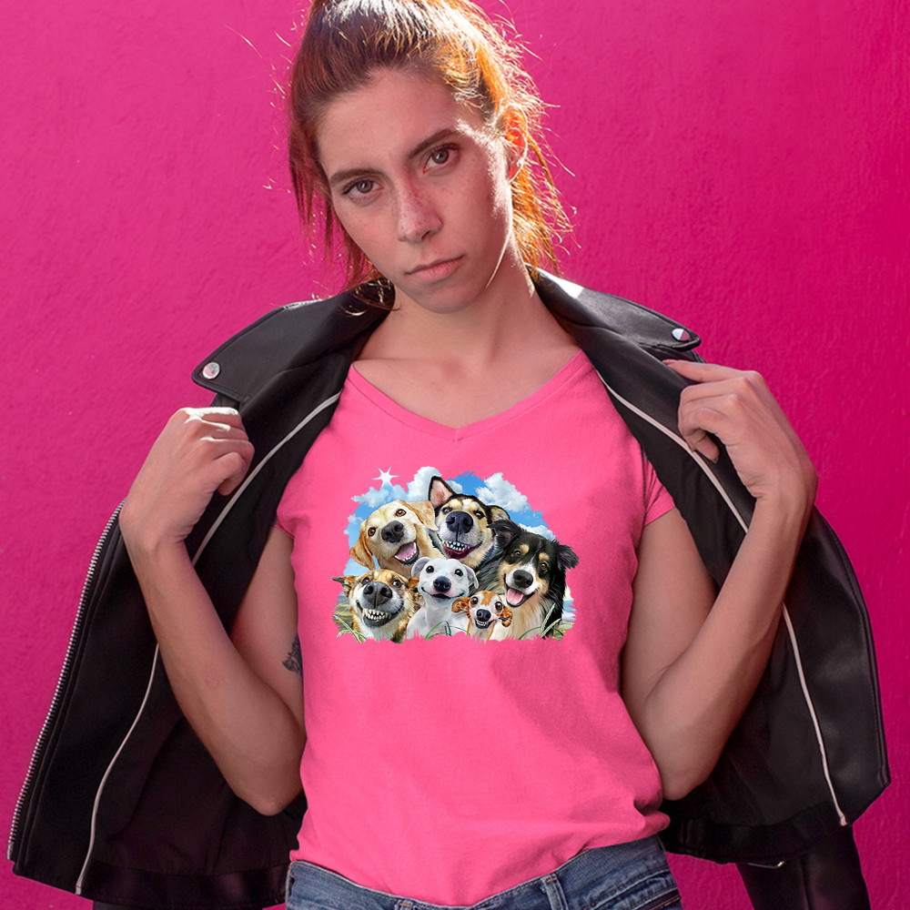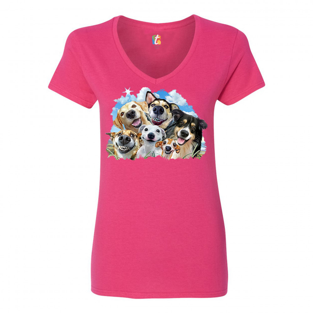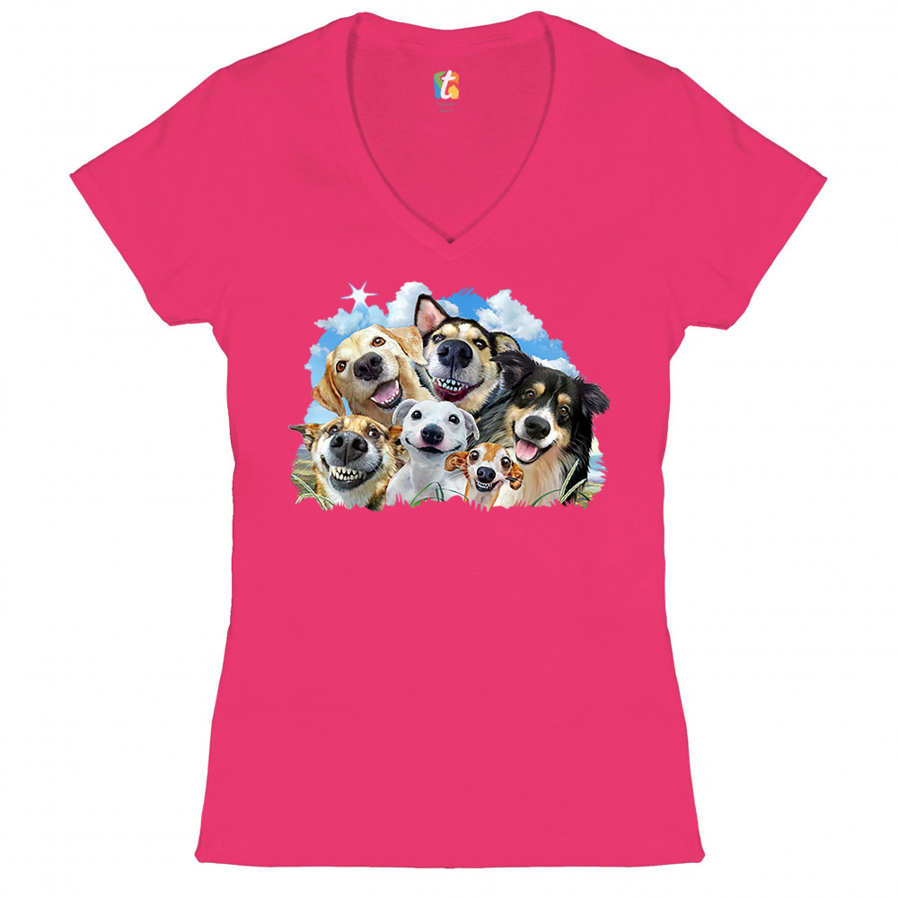 SMILING DOGS' SELFIE women's v-neck t-shirt funny animal dog lover cute tee pink