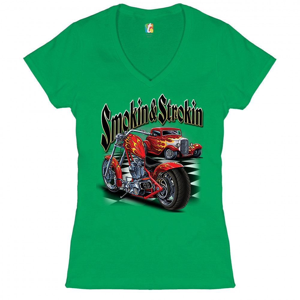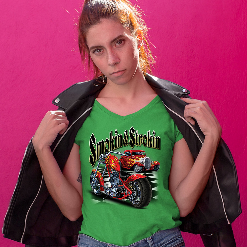 SMOKIN & STROKIN women's v-neck t-shirt chopper biker hot rod live to ride tee green