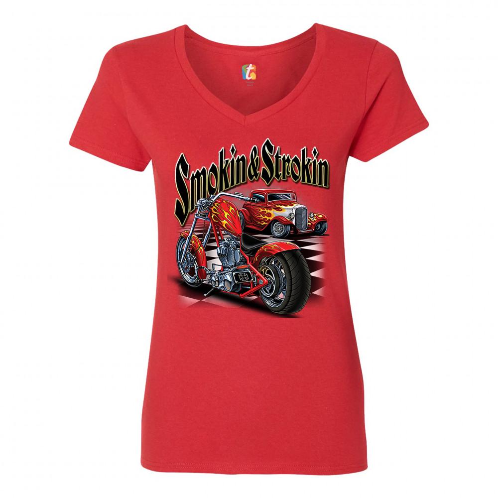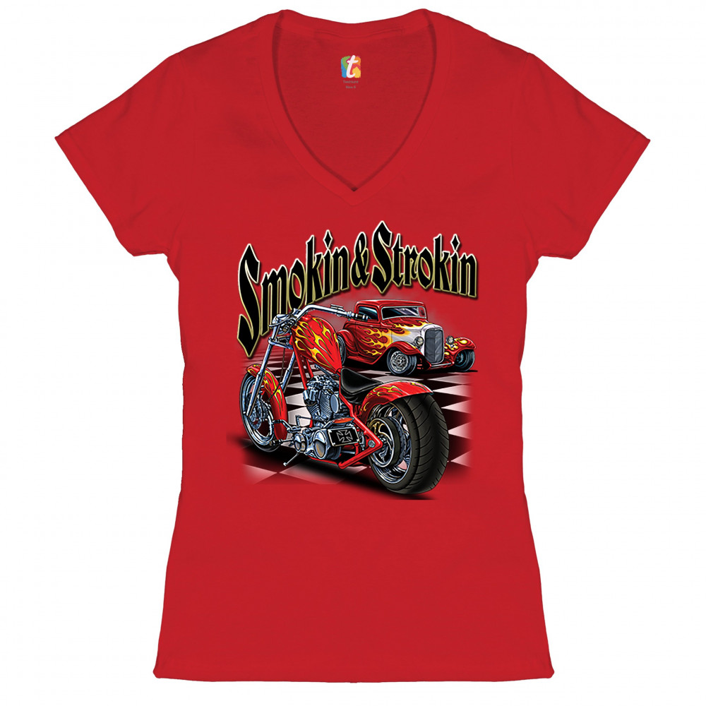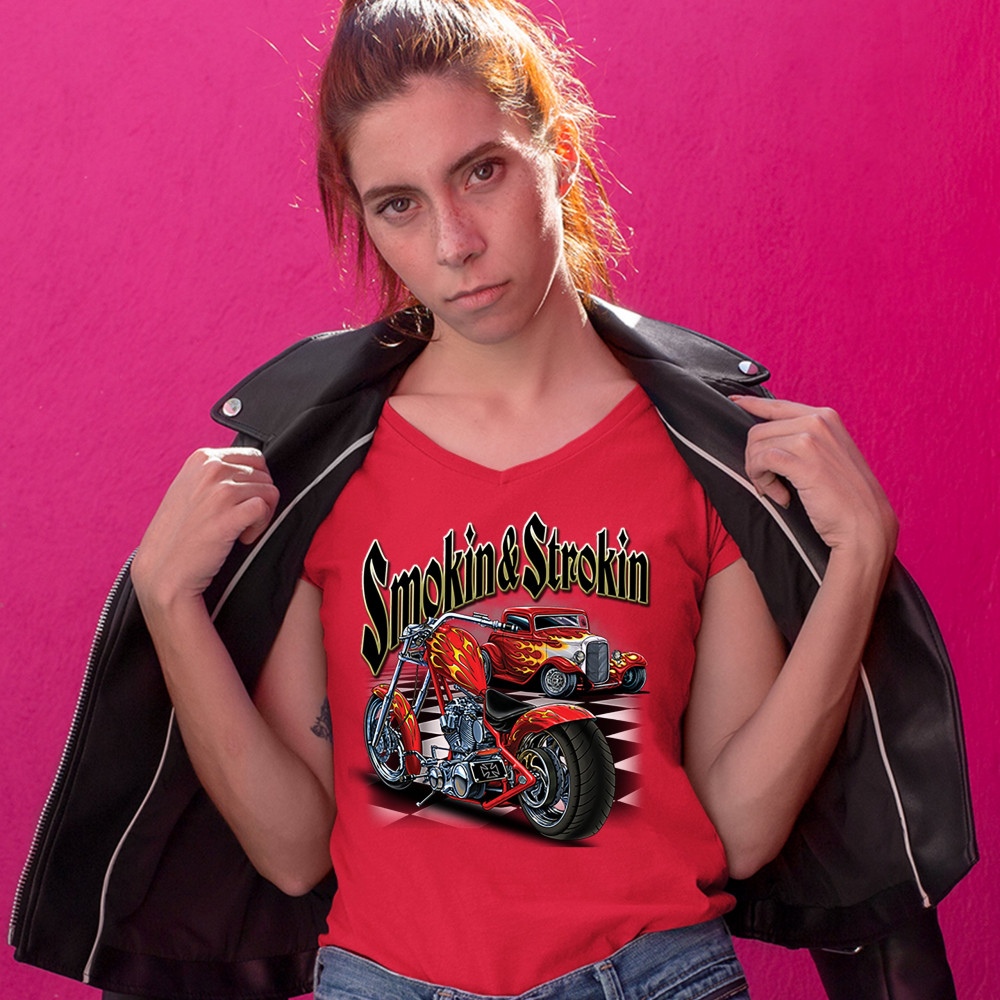 SMOKIN & STROKIN women's v-neck t-shirt chopper biker hot rod live to ride tee red